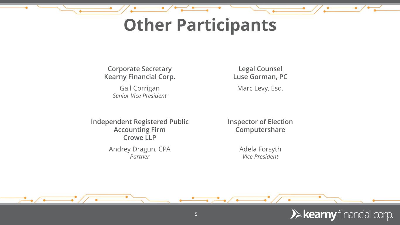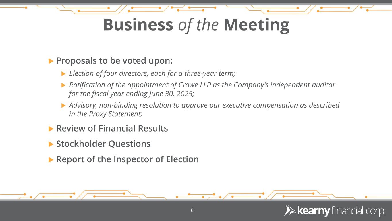 Other Participants Corporate Secretary Kearny Financial Corp. Gail Corrigan Senior Vice President Legal Counsel Luse Gorman, PC Marc Levy, Esq. Independent Registered Public Accounting Firm Crowe LLP Andrey Dragun, CPA Partner Inspector of Election Computershare Adela Forsyth Vice President 5