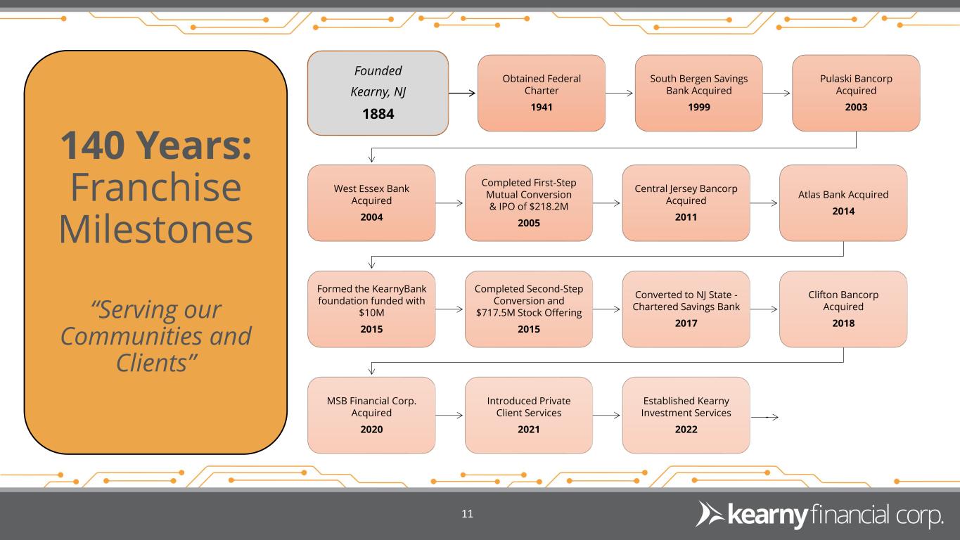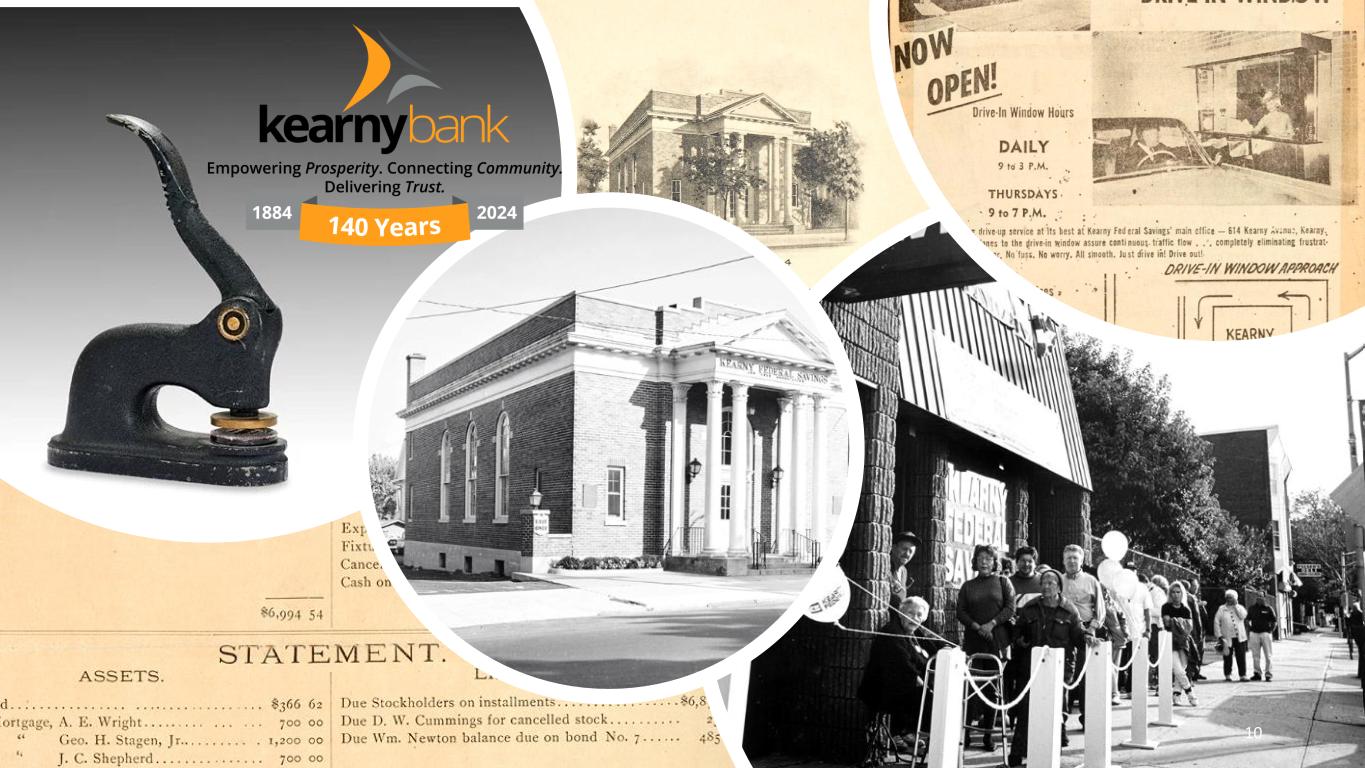 Kearny Financial Corp. Company Overview NASDAQ: KRNY Founded: 1884 Assets: $7.7 billion Loans: $5.7 billion Deposits: $5.2 billion TBV Per Share: $9.90 Market Cap: $443.7 million1 1 As of September 30, 2024 Source: S&P Global Market Intelligence & Company Filings 9 Branch/Office Footprint Company Profile Top 10 New Jersey-based financial institution by assets & deposits. 43 full-service branches in 12 counties throughout New Jersey and New York City. Active acquirer, having completed 7 whole-bank acquisitions since 1999. Focus is on helping our clients achieve their financial goals for today and aspirations for tomorrow – creating communities that thrive.