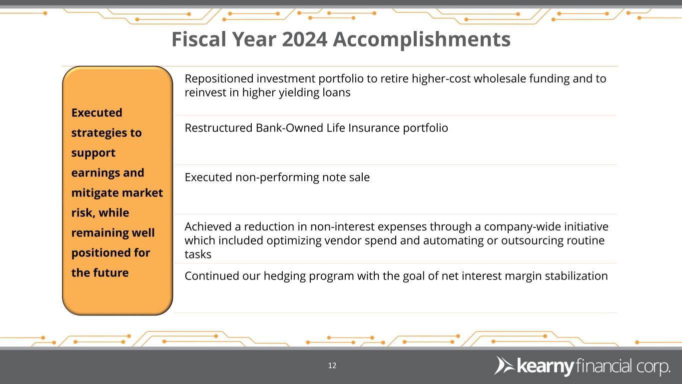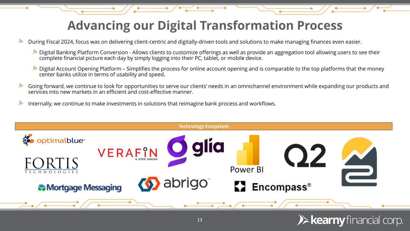 Executed strategies to support earnings and mitigate market risk, while remaining well positioned for the future Repositioned investment portfolio to retire higher-cost wholesale funding and to reinvest in higher yielding loans Restructured Bank-Owned Life Insurance portfolio Executed non-performing note sale Achieved a reduction in non-interest expenses through a company-wide initiative which included optimizing vendor spend and automating or outsourcing routine tasks Continued our hedging program with the goal of net interest margin stabilization Fiscal Year 2024 Accomplishments 12