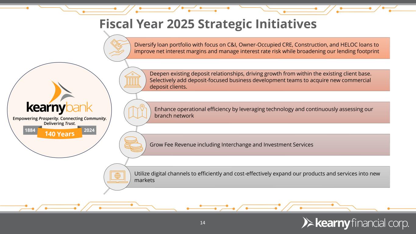 Advancing our Digital Transformation Process 13 Technology Ecosystem During Fiscal 2024, focus was on delivering client-centric and digitally-driven tools and solutions to make managing finances even easier. Digital Banking Platform Conversion - Allows clients to customize offerings as well as provide an aggregation tool allowing users to see their complete financial picture each day by simply logging into their PC, tablet, or mobile device. Digital Account Opening Platform – Simplifies the process for online account opening and is comparable to the top platforms that the money center banks utilize in terms of usability and speed. Going forward, we continue to look for opportunities to serve our clients’ needs in an omnichannel environment while expanding our products and services into new markets in an efficient and cost-effective manner. Internally, we continue to make investments in solutions that reimagine bank process and workflows.