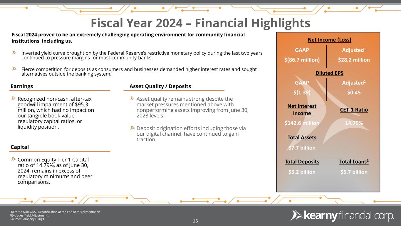15 Liability-Sensitive balance sheet optimally positioned for rate cuts and yield curve normalization. Low-cost core deposit base is expected to reprice more rapidly than assets as the majority of assets are fixed-rate in nature. Liability Sensitive Minimal exposure to New York City office and rent regulated multifamily properties, as percentage of total loans. Historical net charge-offs to average total loans have been consistently below peer averages. Strong Historical Asset Quality Disciplined cost control measures focused on eliminating inefficiencies and optimizing resources, thereby ensuring sustainable financial health and improved profitability. Advance technological innovation by implementing robotic process automation (RPA) and artificial intelligence (AI) to optimize efficiency and streamline operations. Operating Efficiency Positioned for Earnings Growth in a Declining Rate Environment:
