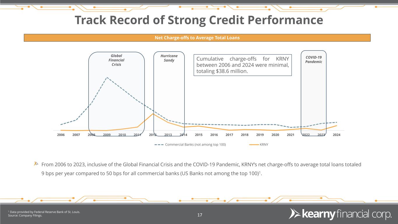Fiscal Year 2024 – Financial Highlights 1 Refer to Non-GAAP Reconciliation at the end of this presentation 2 Excludes Yield Adjustments Source: Company Filings 16 Net Income (Loss) GAAP Adjusted1 $(86.7 million) $28.2 million Diluted EPS GAAP Adjusted1 $(1.39) $0.45 Net Interest Income CET-1 Ratio $142.6 million 14.79% Total Assets $7.7 billion Total Deposits Total Loans2 $5.2 billion $5.7 billion Capital Common Equity Tier 1 Capital ratio of 14.79%, as of June 30, 2024, remains in excess of regulatory minimums and peer comparisons. Earnings Recognized non-cash, after-tax goodwill impairment of $95.3 million, which had no impact on our tangible book value, regulatory capital ratios, or liquidity position. Asset Quality / Deposits Asset quality remains strong despite the market pressures mentioned above with nonperforming assets improving from June 30, 2023 levels. Deposit origination efforts including those via our digital channel, have continued to gain traction. Fiscal 2024 proved to be an extremely challenging operating environment for community financial institutions, including us. Inverted yield curve brought on by the Federal Reserve’s restrictive monetary policy during the last two years continued to pressure margins for most community banks. Fierce competition for deposits as consumers and businesses demanded higher interest rates and sought alternatives outside the banking system.