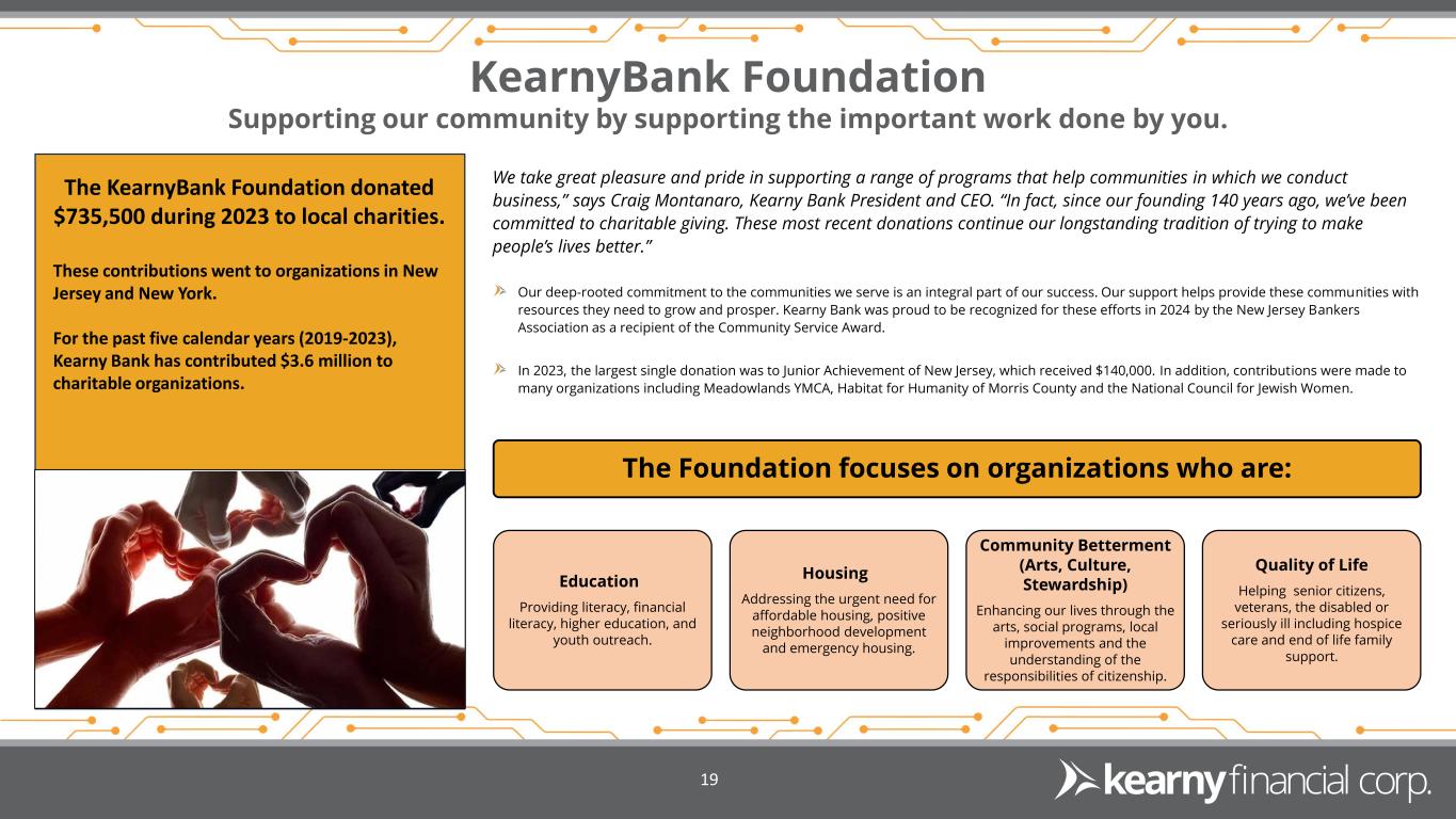 KearnyBank Foundation Supporting our community by supporting the important work done by you. 19 The KearnyBank Foundation donated $735,500 during 2023 to local charities. These contributions went to organizations in New Jersey and New York. For the past five calendar years (2019-2023), Kearny Bank has contributed $3.6 million to charitable organizations. The Foundation focuses on organizations who are: Education Providing literacy, financial literacy, higher education, and youth outreach. Housing Addressing the urgent need for affordable housing, positive neighborhood development and emergency housing. Community Betterment (Arts, Culture, Stewardship) Enhancing our lives through the arts, social programs, local improvements and the understanding of the responsibilities of citizenship. Quality of Life Helping senior citizens, veterans, the disabled or seriously ill including hospice care and end of life family support. We take great pleasure and pride in supporting a range of programs that help communities in which we conduct business,” says Craig Montanaro, Kearny Bank President and CEO. “In fact, since our founding 140 years ago, we’ve been committed to charitable giving. These most recent donations continue our longstanding tradition of trying to make people’s lives better.” Our deep-rooted commitment to the communities we serve is an integral part of our success. Our support helps provide these communities with resources they need to grow and prosper. Kearny Bank was proud to be recognized for these efforts in 2024 by the New Jersey Bankers Association as a recipient of the Community Service Award. In 2023, the largest single donation was to Junior Achievement of New Jersey, which received $140,000. In addition, contributions were made to many organizations including Meadowlands YMCA, Habitat for Humanity of Morris County and the National Council for Jewish Women.