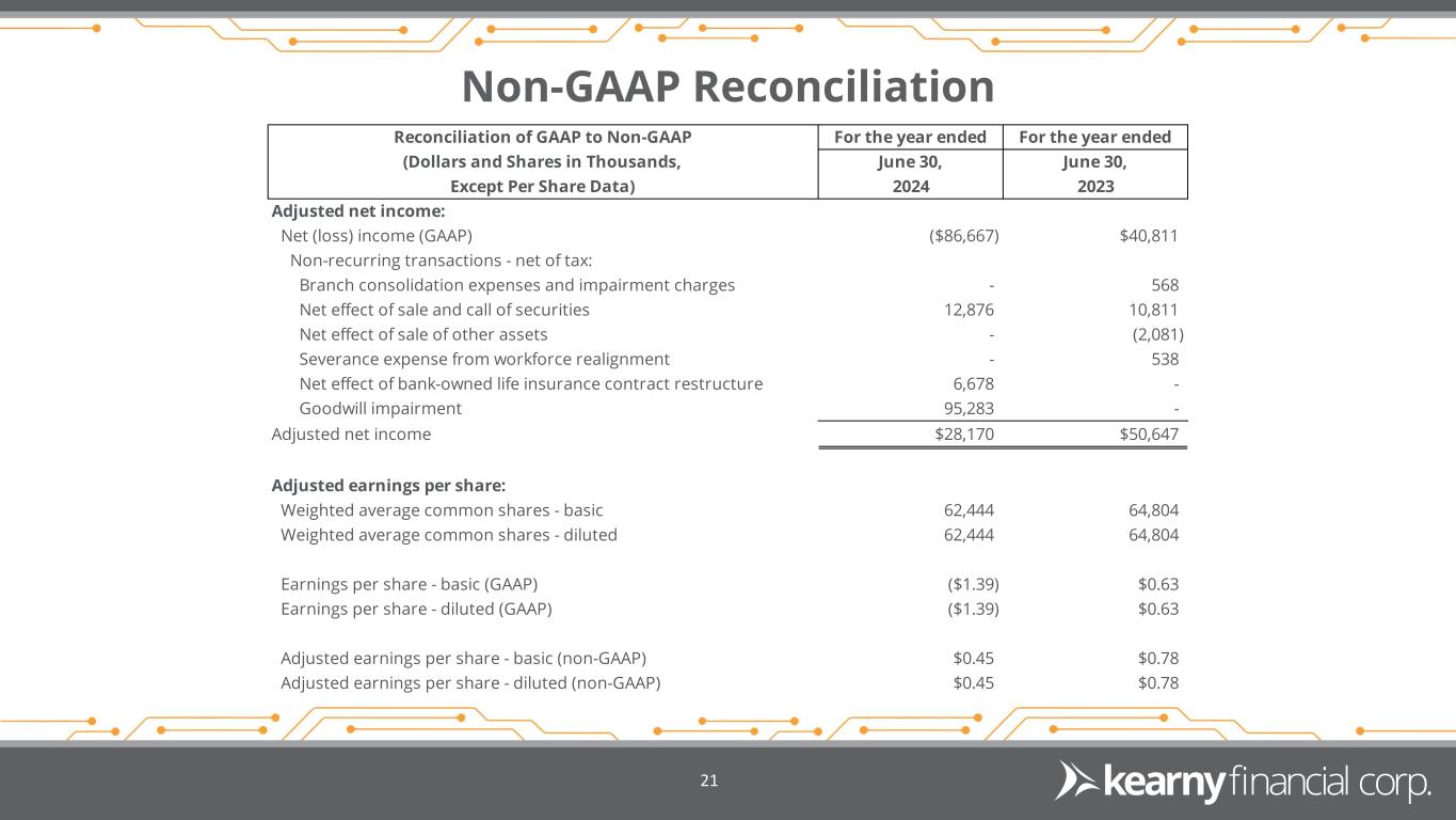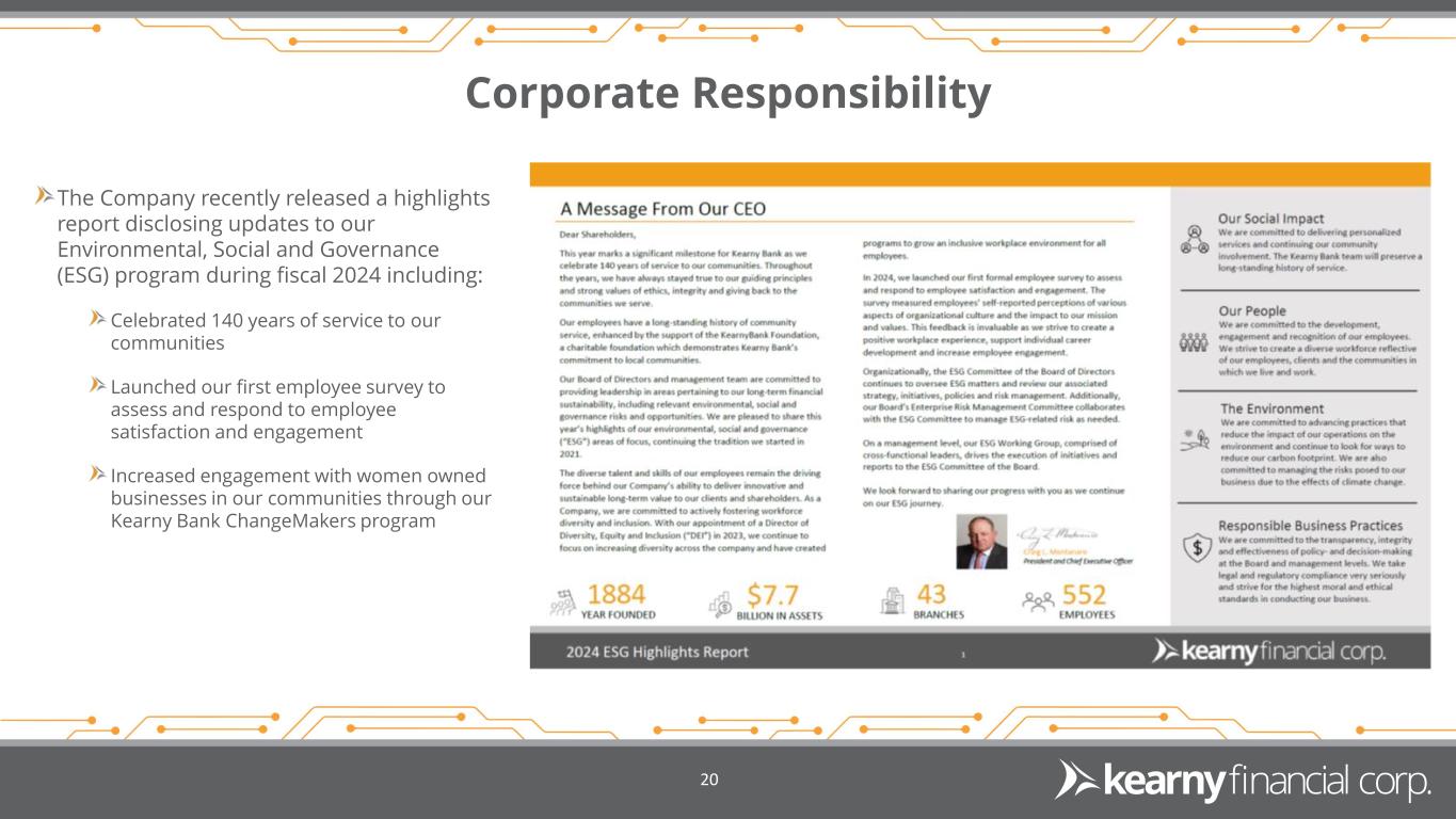 Corporate Responsibility 20 The Company recently released a highlights report disclosing updates to our Environmental, Social and Governance (ESG) program during fiscal 2024 including: Celebrated 140 years of service to our communities Launched our first employee survey to assess and respond to employee satisfaction and engagement Increased engagement with women owned businesses in our communities through our Kearny Bank ChangeMakers program