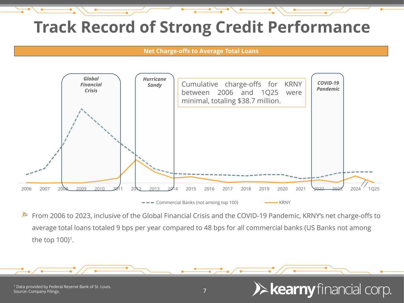 Capital Strength Equity Capitalization Level 1 Kearny Financial Corp. (NASDAQ: KRNY) Regulatory Capital Ratios as of September 30, 2024 are preliminary. 2 Equity to Asset ratio, for September 30, 2024 going forward, was impacted by previously disclosed goodwill impairment. Source: Company Filings. 6 Regulatory Capital Ratios1,2 8.20% 8.26% 8.34% 8.43% 8.31% 10.65% 10.74% 10.83% 9.81% 9.67% 1Q24 2Q24 3Q24 4Q24 1Q25 Tangible Common Equity / Tangible Assets Equity / Assets 2 9.14% 14.60% 14.60% 15.46% 5.00% 6.50% 8.00% 10.00% Tier 1 Leverage Common Equity Tier 1 Tier 1 Risk-Based Capital Total Risk-Based Capital KRNY Well Capitalized Regulatory Minimum