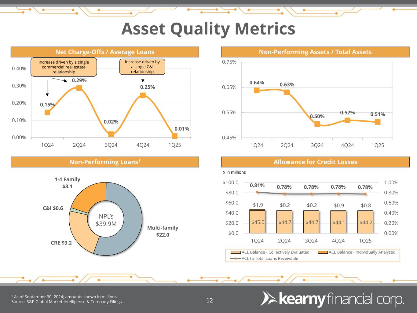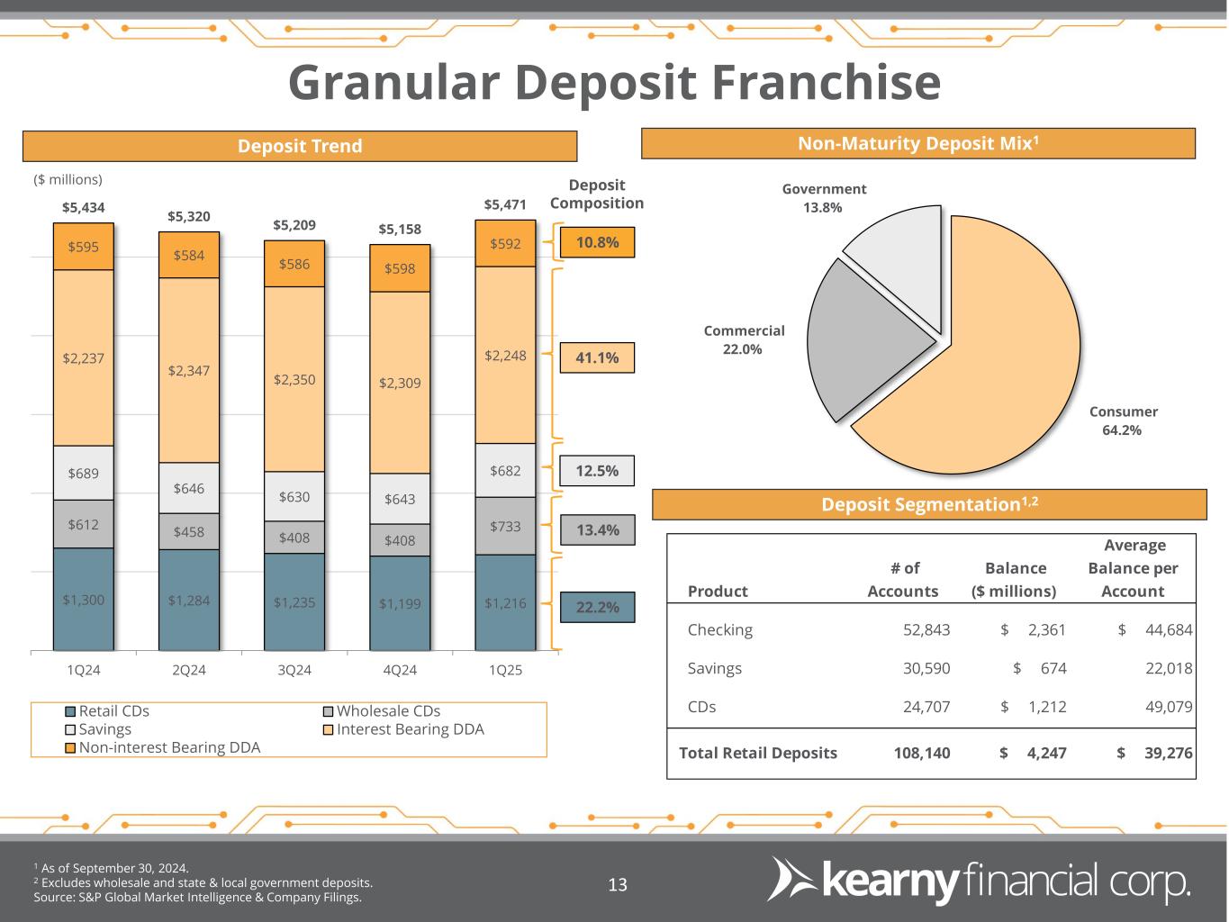Asset Quality Metrics Non-Performing Assets / Total Assets Non-Performing Loans1 Allowance for Credit Losses 1 As of September 30, 2024; amounts shown in millions. Source: S&P Global Market Intelligence & Company Filings. 12 Net Charge-Offs / Average Loans $ in millions 0.64% 0.63% 0.50% 0.52% 0.51% 0.45% 0.55% 0.65% 0.75% 1Q24 2Q24 3Q24 4Q24 1Q25 Multi-family $22.0 CRE $9.2 C&I $0.6 1-4 Family $8.1 0.15% 0.29% 0.02% 0.25% 0.01% 0.00% 0.10% 0.20% 0.30% 0.40% 1Q24 2Q24 3Q24 4Q24 1Q25 Increase driven by a single commercial real estate relationship Increase driven by a single C&I relationship $45.0 $44.7 $44.7 $44.1 $44.2 $1.9 $0.2 $0.2 $0.9 $0.8 0.81% 0.78% 0.78% 0.78% 0.78% 0.00% 0.20% 0.40% 0.60% 0.80% 1.00% $0.0 $20.0 $40.0 $60.0 $80.0 $100.0 1Q24 2Q24 3Q24 4Q24 1Q25 ACL Balance - Collectively Evaluated ACL Balance - Individually Analyzed ACL to Total Loans Receivable NPL’s $39.9M