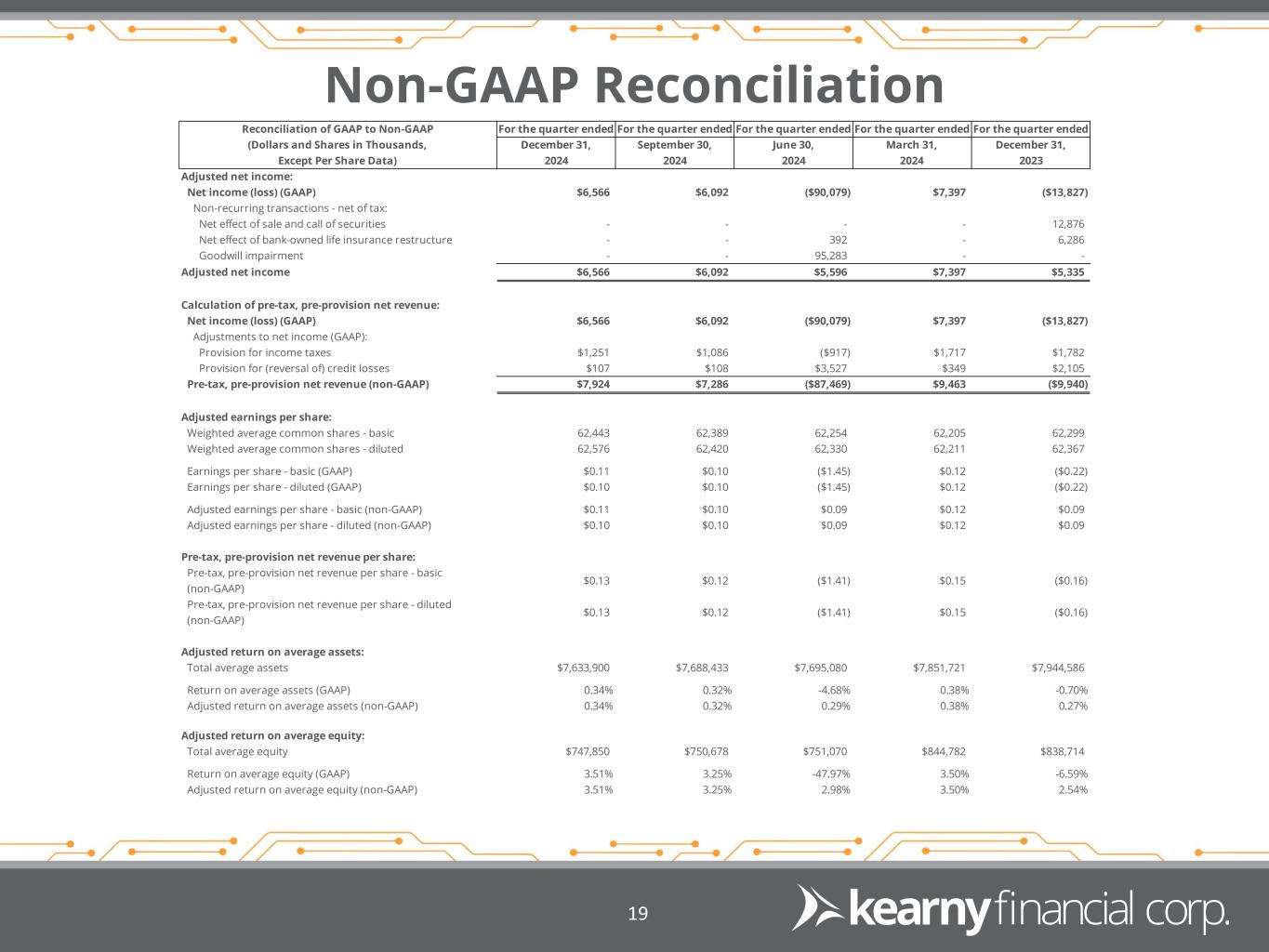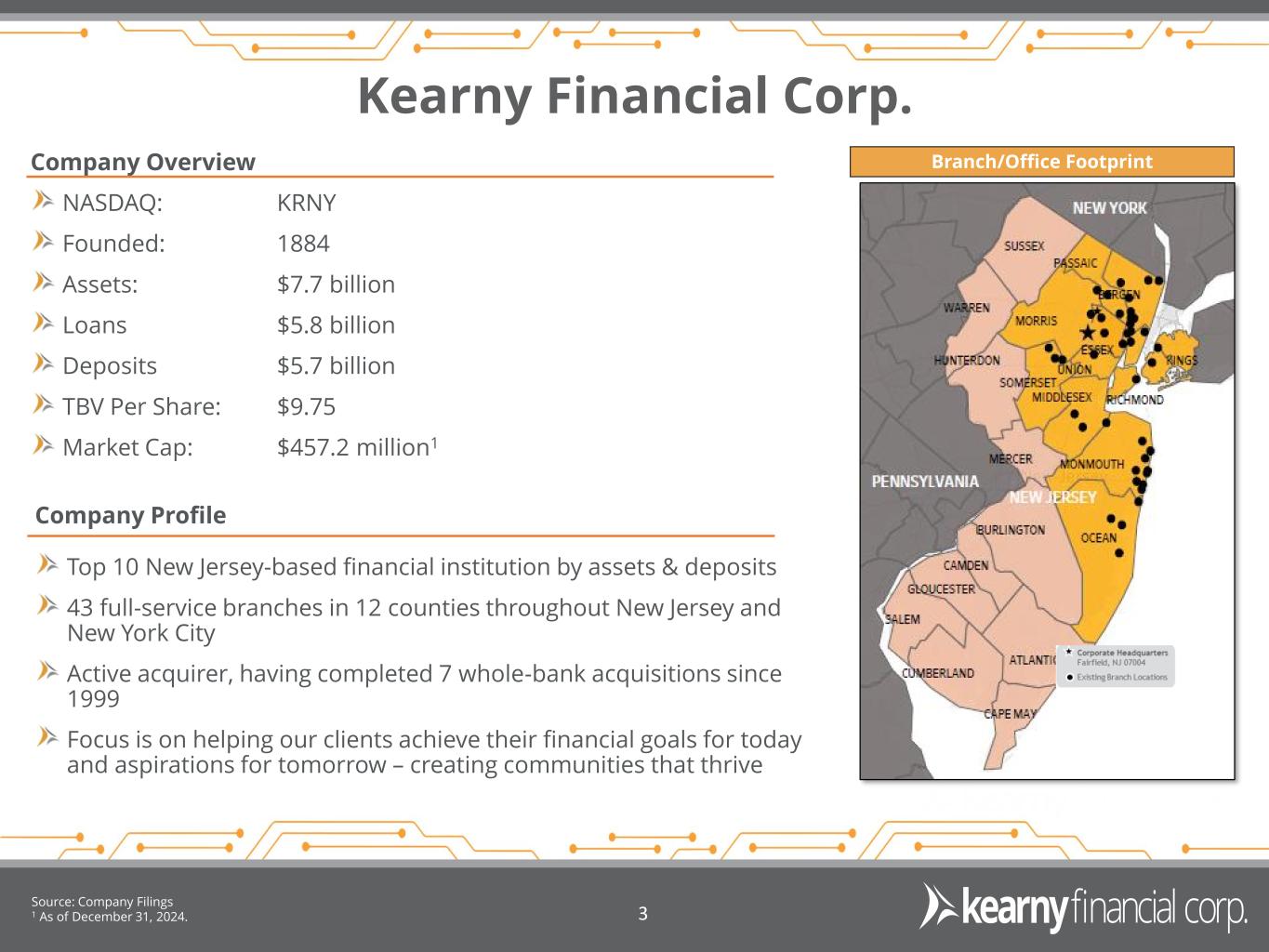 Forward Looking Statements & Financial Measures 2 This presentation may include certain “forward-looking statements,” which are made in good faith by Kearny Financial Corp. (the “Company”) pursuant to the “safe harbor” provisions of the Private Securities Litigation Reform Act of 1995. These forward-looking statements are subject to risks and uncertainties, such as statements of the Company’s plans, objectives, expectations, estimates and intentions that are subject to change based on various important factors (some of which are beyond the Company’s control). In addition to the factors described under Item 1A. Risk Factors in the Company’s Annual Report on Form 10-K, and subsequent filings with the Securities and Exchange Commission, the following factors, among others, could cause the Company’s financial performance to differ materially from the plans, objectives, expectations, estimates and intentions expressed in such forward-looking statements: • the strength of the United States economy in general and the strength of the local economy in which the Company conducts operations, • the effects of, and changes in, trade, monetary and fiscal policies and laws, including interest rate policies of the Board of Governors of the Federal Reserve System, inflation, interest rates, market and monetary fluctuations, • the impact of changes in laws, regulations and government policies regarding financial institutions (including laws concerning taxation, banking, securities and insurance), • changes in accounting policies and practices, as may be adopted by regulatory agencies, the Financial Accounting Standards Board (“FASB”) or the Public Company Accounting Oversight Board, • technological changes, • competition among financial services providers, and • the success of the Company at managing the risks involved in the foregoing and managing its business. The Company cautions that the foregoing list of important factors is not exhaustive. Readers should not place any undue reliance on any forward looking statements, which speak only as of the date made. The Company does not undertake any obligation to update any forward-looking statement, whether written or oral, that may be made from time to time by or on behalf of the Company. This presentation contains financial information determined by methods other than in accordance with accounting principles generally accepted in the United States of America (“GAAP”). Management uses these “non-GAAP” measures in its analysis of the Company’s performance. Management believes these non-GAAP financial measures allow for better comparability of period to period operating performance. Additionally, the Company believes this information is utilized by regulators and market analysts to evaluate a company’s financial condition and therefore, such information is useful to investors. These disclosures should not be viewed as a substitute for operating results determined in accordance with GAAP, nor are they necessarily comparable to non-GAAP performance measures that may be presented by other companies. A reconciliation of the non-GAAP measures used in this presentation to the most directly comparable GAAP measures is provided in the Appendix to this presentation.