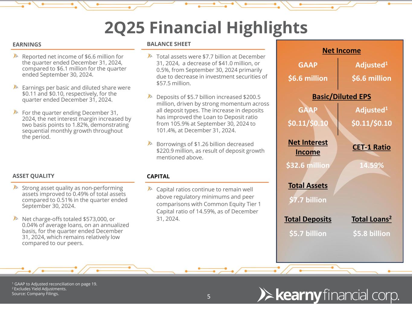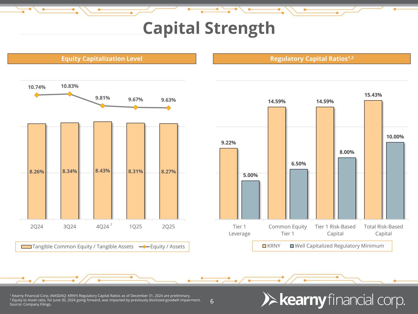 2Q25 Financial Highlights 1 GAAP to Adjusted reconciliation on page 19. 2 Excludes Yield Adjustments. Source: Company Filings. 5 Net Income GAAP Adjusted1 $6.6 million $6.6 million Basic/Diluted EPS GAAP Adjusted1 $0.11/$0.10 $0.11/$0.10 Net Interest Income CET-1 Ratio $32.6 million 14.59% Total Assets $7.7 billion Total Deposits Total Loans2 $5.7 billion $5.8 billion ASSET QUALITY Strong asset quality as non-performing assets improved to 0.49% of total assets compared to 0.51% in the quarter ended September 30, 2024. Net charge-offs totaled $573,000, or 0.04% of average loans, on an annualized basis, for the quarter ended December 31, 2024, which remains relatively low compared to our peers. EARNINGS Reported net income of $6.6 million for the quarter ended December 31, 2024, compared to $6.1 million for the quarter ended September 30, 2024. Earnings per basic and diluted share were $0.11 and $0.10, respectively, for the quarter ended December 31, 2024. For the quarter ending December 31, 2024, the net interest margin increased by two basis points to 1.82%, demonstrating sequential monthly growth throughout the period. BALANCE SHEET Total assets were $7.7 billion at December 31, 2024, a decrease of $41.0 million, or 0.5%, from September 30, 2024 primarily due to decrease in investment securities of $57.5 million. Deposits of $5.7 billion increased $200.5 million, driven by strong momentum across all deposit types. The increase in deposits has improved the Loan to Deposit ratio from 105.9% at September 30, 2024 to 101.4%, at December 31, 2024. Borrowings of $1.26 billion decreased $220.9 million, as result of deposit growth mentioned above. CAPITAL Capital ratios continue to remain well above regulatory minimums and peer comparisons with Common Equity Tier 1 Capital ratio of 14.59%, as of December 31, 2024.