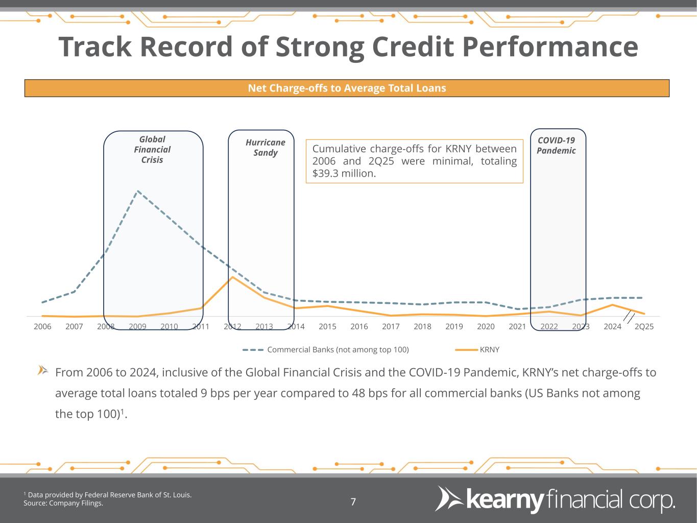 Capital Strength Equity Capitalization Level 1 Kearny Financial Corp. (NASDAQ: KRNY) Regulatory Capital Ratios as of December 31, 2024 are preliminary. 2 Equity to Asset ratio, for June 30, 2024 going forward, was impacted by previously disclosed goodwill impairment. Source: Company Filings. 6 Regulatory Capital Ratios1,2 8.26% 8.34% 8.43% 8.31% 8.27% 10.74% 10.83% 9.81% 9.67% 9.63% 2Q24 3Q24 4Q24 1Q25 2Q25 Tangible Common Equity / Tangible Assets Equity / Assets 2 9.22% 14.59% 14.59% 15.43% 5.00% 6.50% 8.00% 10.00% Tier 1 Leverage Common Equity Tier 1 Tier 1 Risk-Based Capital Total Risk-Based Capital KRNY Well Capitalized Regulatory Minimum