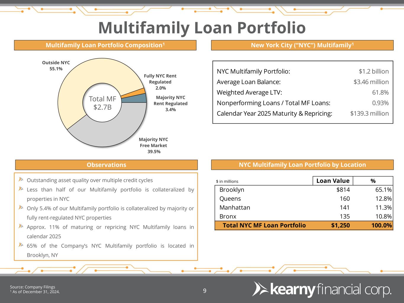Diversified Loan Portfolio Loan Composition1 Geographic Distribution1 Loan Trend 1 As of December 31, 2024. Source: S&P Global Market Intelligence & Company Filings. 8 ($ millions) 1-4 Family 30.4% Home Equity 0.8% Multi-family 46.9% CRE 16.4% Construction 3.1% C&I 2.3%QTD Yield on Loans 4.54% New York 33.0% New Jersey 55.8% Pennsylvania 6.2% Other 5.0% LTV 60.9% $1,746 $1,742 $1,756 $1,768 $1,765 $2,651 $2,645 $2,646 $2,646 $2,723 $947 $966 $948 $951 $950 $5,757 $5,775 $5,749 $5,786 $5,800 2Q24 3Q24 4Q24 1Q25 2Q25 1-4 Family Home Equity Multi-family CRE Construction C&I