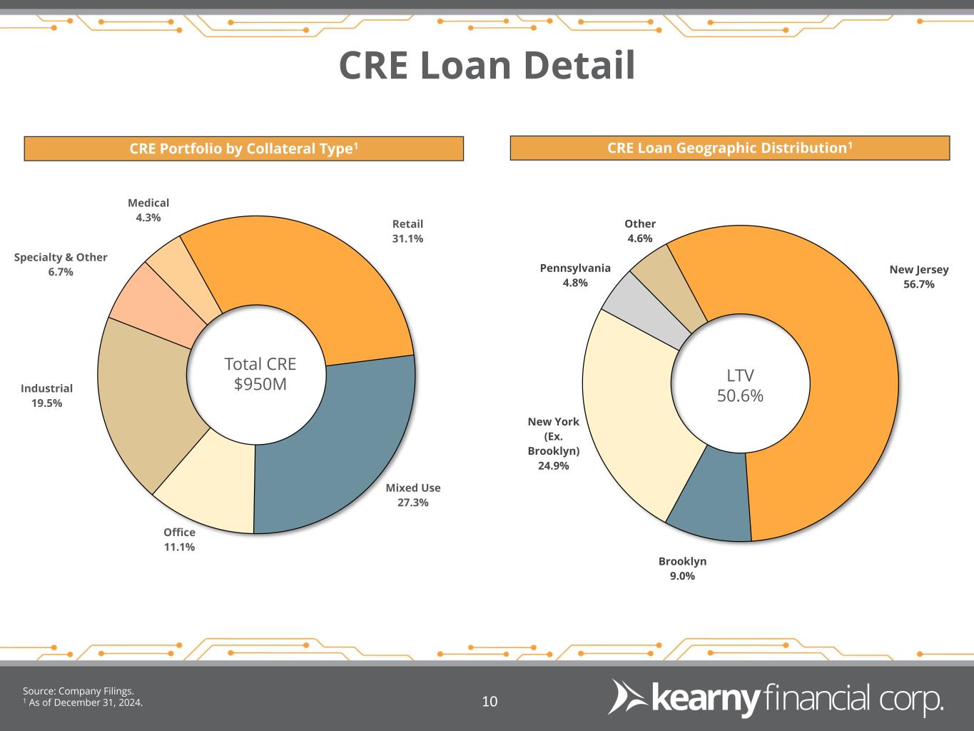 Multifamily Loan Portfolio Multifamily Loan Portfolio Composition1 New York City (“NYC”) Multifamily1 Source: Company Filings 1 As of December 31, 2024. 9 Outstanding asset quality over multiple credit cycles Less than half of our Multifamily portfolio is collateralized by properties in NYC Only 5.4% of our Multifamily portfolio is collateralized by majority or fully rent-regulated NYC properties Approx. 11% of maturing or repricing NYC Multifamily loans in calendar 2025 65% of the Company’s NYC Multifamily portfolio is located in Brooklyn, NY Observations Majority NYC Free Market 39.5% Outside NYC 55.1% Fully NYC Rent Regulated 2.0% Majority NYC Rent Regulated 3.4% Total MF $2.7B NYC Multifamily Portfolio: $1.2 billion Average Loan Balance: $3.46 million Weighted Average LTV: 61.8% Nonperforming Loans / Total MF Loans: 0.93% Calendar Year 2025 Maturity & Repricing: $139.3 million Loan Value % Brooklyn $814 65.1% Queens 160 12.8% Manhattan 141 11.3% Bronx 135 10.8% Total NYC MF Loan Portfolio $1,250 100.0% $ in millions NYC Multifamily Loan Portfolio by Location
