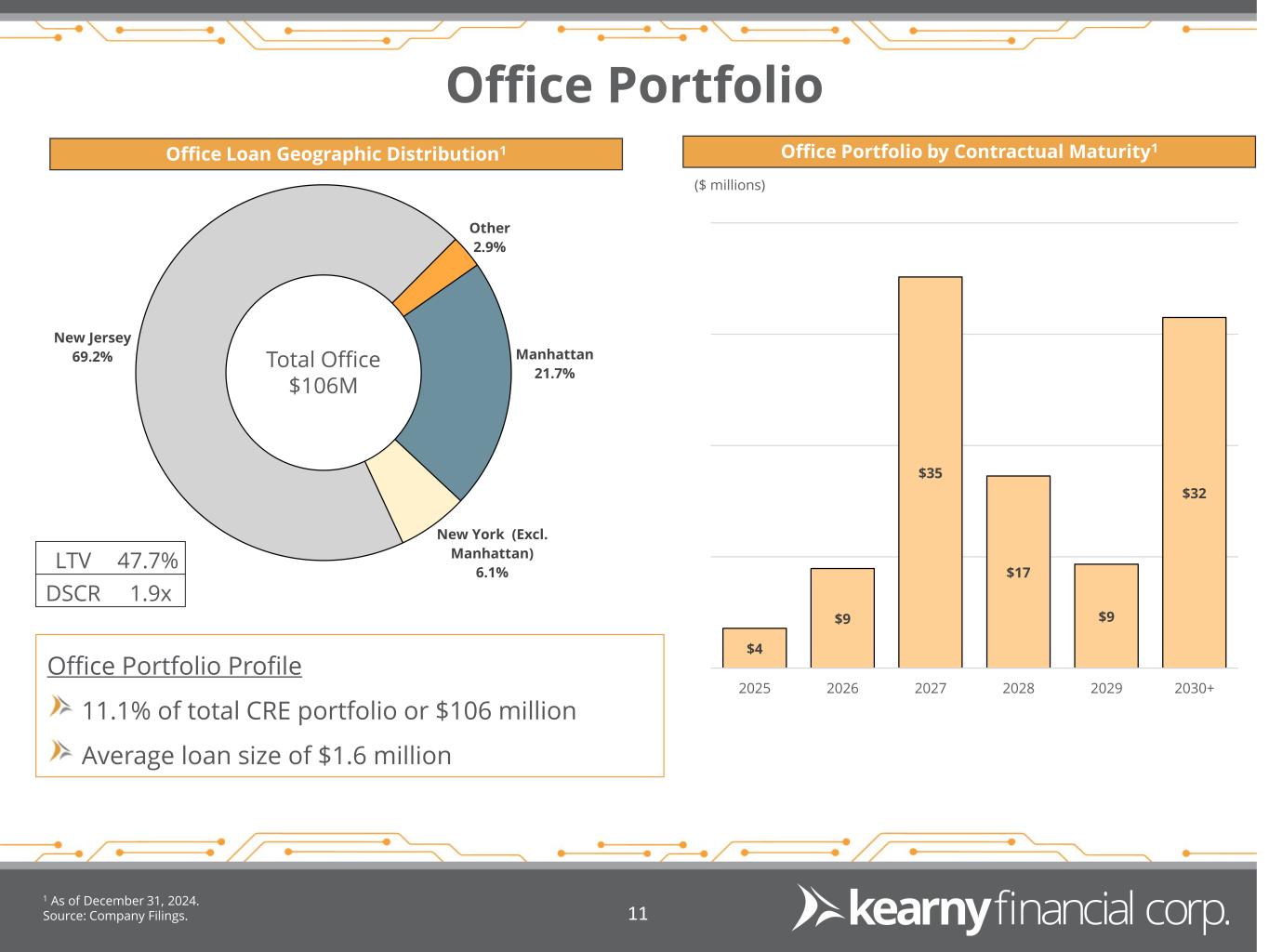 CRE Loan Detail Source: Company Filings. 1 As of December 31, 2024. 10 CRE Portfolio by Collateral Type1 CRE Loan Geographic Distribution1 New Jersey 56.7% Brooklyn 9.0% New York (Ex. Brooklyn) 24.9% Pennsylvania 4.8% Other 4.6% Retail 31.1% Mixed Use 27.3% Office 11.1% Industrial 19.5% Specialty & Other 6.7% Medical 4.3% Total CRE $950M LTV 50.6%