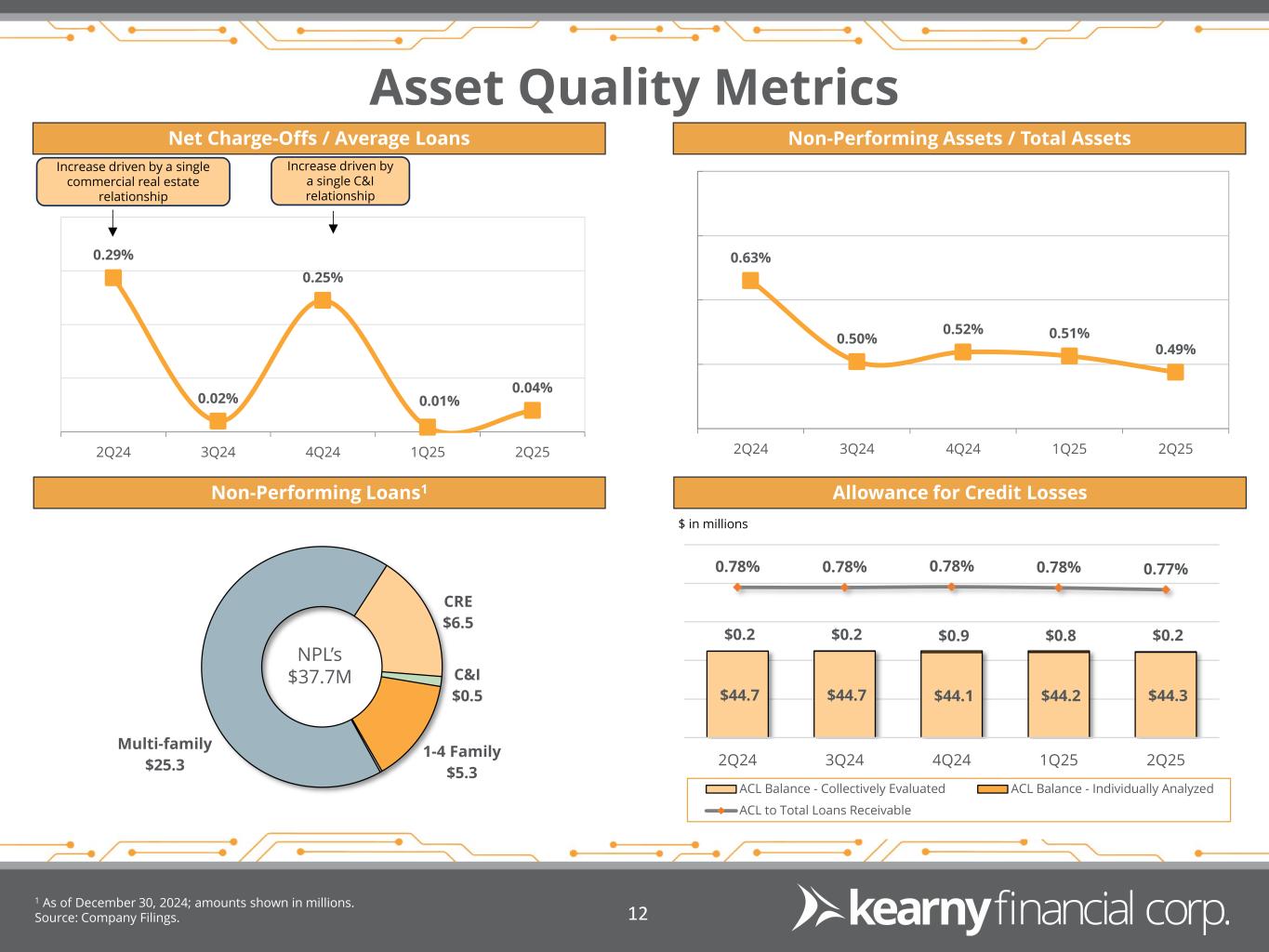 Asset Quality Metrics Non-Performing Assets / Total Assets Allowance for Credit Losses 1 As of December 30, 2024; amounts shown in millions. Source: Company Filings. 12 Net Charge-Offs / Average Loans Increase driven by a single commercial real estate relationship Increase driven by a single C&I relationship 0.29% 0.02% 0.25% 0.01% 0.04% 2Q24 3Q24 4Q24 1Q25 2Q25 0.63% 0.50% 0.52% 0.51% 0.49% 2Q24 3Q24 4Q24 1Q25 2Q25 $44.7 $44.7 $44.1 $44.2 $44.3 $0.2 $0.2 $0.9 $0.8 $0.2 0.78% 0.78% 0.78% 0.78% 0.77% 2Q24 3Q24 4Q24 1Q25 2Q25 ACL Balance - Collectively Evaluated ACL Balance - Individually Analyzed ACL to Total Loans Receivable Non-Performing Loans1 $ in millions Multi-family $25.3 CRE $6.5 C&I $0.5 1-4 Family $5.3 NPL’s $37.7M