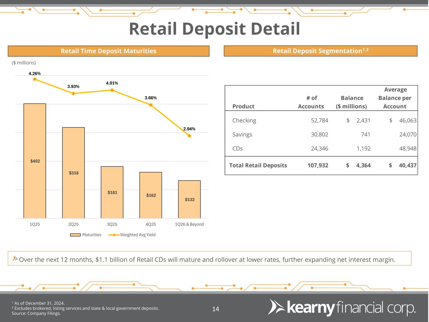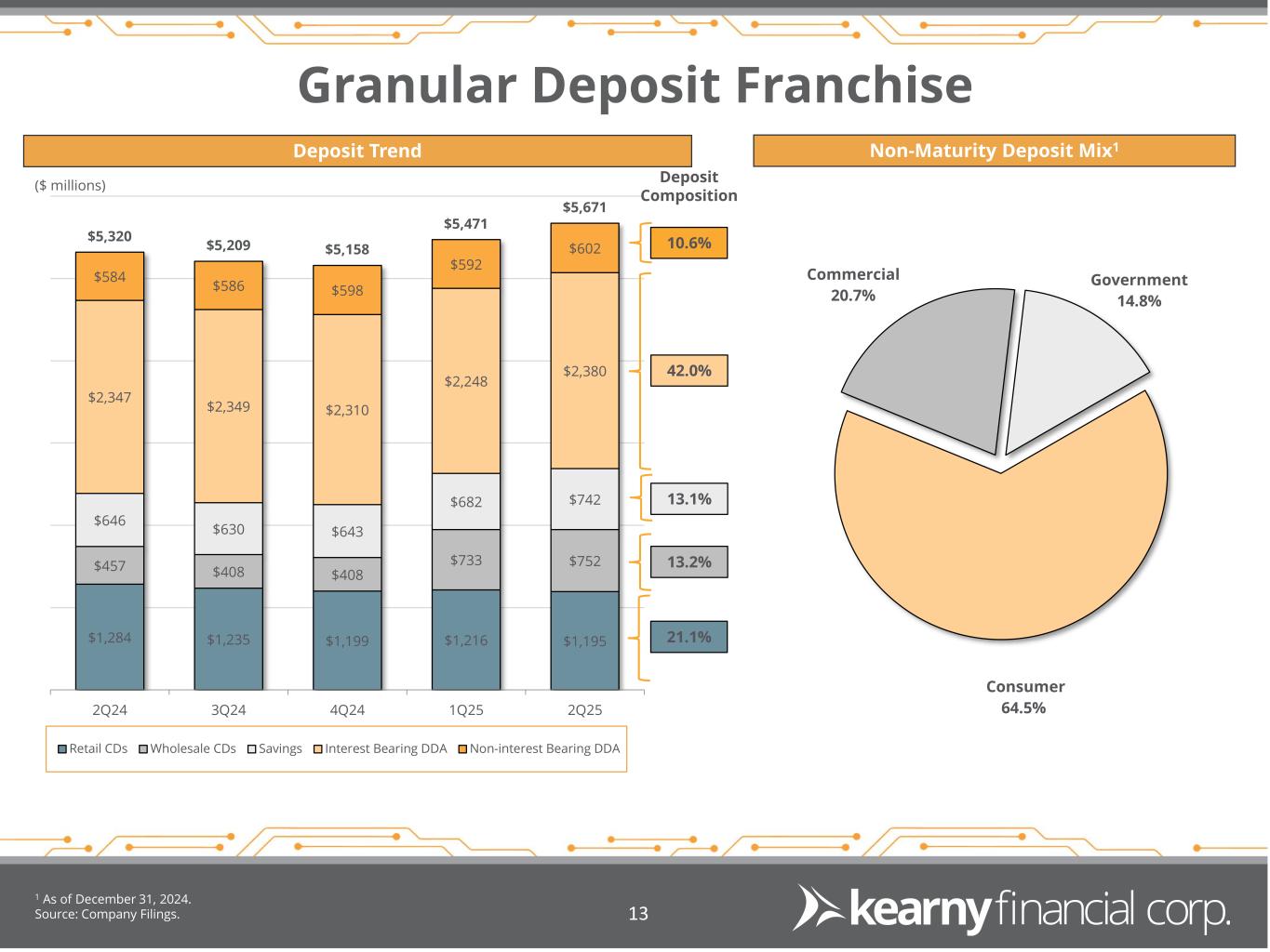 $1,284 $1,235 $1,199 $1,216 $1,195 $457 $408 $408 $733 $752 $646 $630 $643 $682 $742 $2,347 $2,349 $2,310 $2,248 $2,380 $584 $586 $598 $592 $602 $5,320 $5,209 $5,158 $5,471 $5,671 2Q24 3Q24 4Q24 1Q25 2Q25 Retail CDs Wholesale CDs Savings Interest Bearing DDA Non-interest Bearing DDA Granular Deposit Franchise 1 As of December 31, 2024. Source: Company Filings. 13 Deposit Trend Non-Maturity Deposit Mix1 ($ millions) 21.1% 13.2% 13.1% 42.0% 10.6% Deposit Composition Consumer 64.5% Commercial 20.7% Government 14.8%