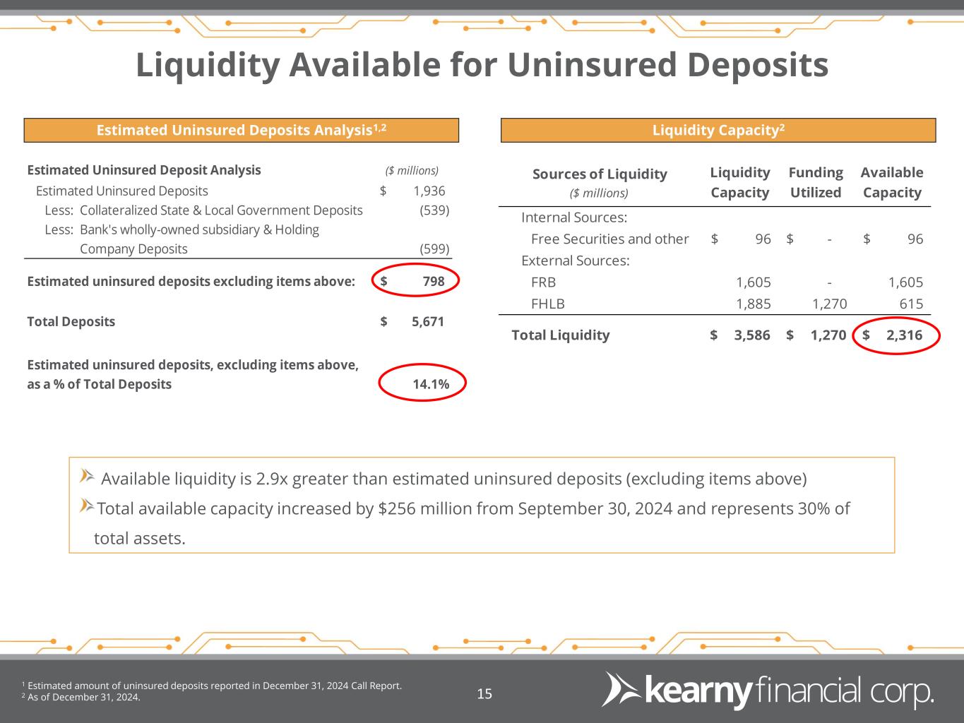 Retail Deposit Detail 1 As of December 31, 2024. 2 Excludes brokered, listing services and state & local government deposits. Source: Company Filings. 14 Retail Time Deposit Maturities Retail Deposit Segmentation1,2 ($ millions) Over the next 12 months, $1.1 billion of Retail CDs will mature and rollover at lower rates, further expanding net interest margin. $402 $318 $181 $162 $132 4.26% 3.93% 4.01% 3.66% 2.94% 1Q25 2Q25 3Q25 4Q25 1Q26 & Beyond Maturities Weighted Avg Yield Product # of Accounts Balance ($ millions) Average Balance per Account Checking 52,784 $ 2,431 $ 46,063 Savings 30,802 741 24,070 CDs 24,346 1,192 48,948 Total Retail Deposits 107,932 $ 4,364 $ 40,437