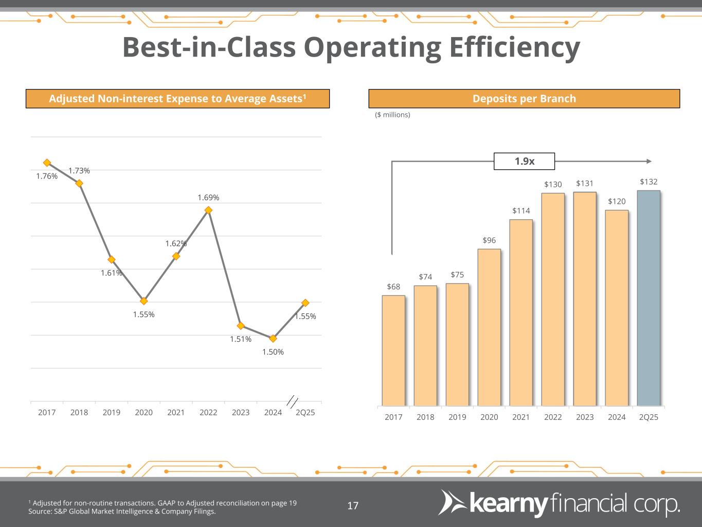 Investment Securities 1 As of December 31, 2024. 2 Comprised entirely of securitized federal education loans with 97% U.S. government guarantees. 3 Assumes 29% marginal tax rate. Source: Company Filings. 16 Securities Composition1 Securities Average Balance & Yield Trend At December 31, 2024, the after-tax net unrecognized loss on securities held-to-maturity was $11.3 million, or 1.79% of tangible equity3 AFS/HTM & Effective Duration Corporate Bonds 12.0% CLO 29.1% ABS Student Loans 6.3% Agency MBS 51.8% Municipal Bonds 0.8% ($ millions) 2 $1,524 $1,397 $1,357 $1,327 $1,296 4.42% 4.46% 4.39% 4.36% 4.28% 2Q24 3Q24 4Q24 1Q25 2Q25 Securities Portfolio Yield on Investments AFS 88.9% HTM 11.1% Total Effective Duration ≈ 3.4 years Floating rate securities ≈ 34.4%