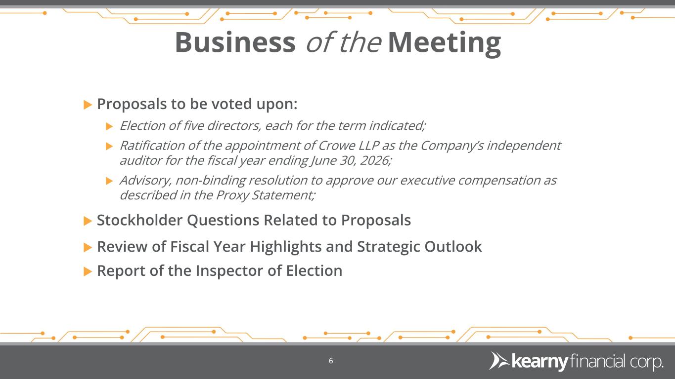 Business of the Meeting  Proposals to be voted upon:  Election of five directors, each for the term indicated;  Ratification of the appointment of Crowe LLP as the Company’s independent auditor for the fiscal year ending June 30, 2026;  Advisory, non-binding resolution to approve our executive compensation as described in the Proxy Statement;  Stockholder Questions Related to Proposals  Review of Fiscal Year Highlights and Strategic Outlook  Report of the Inspector of Election 6