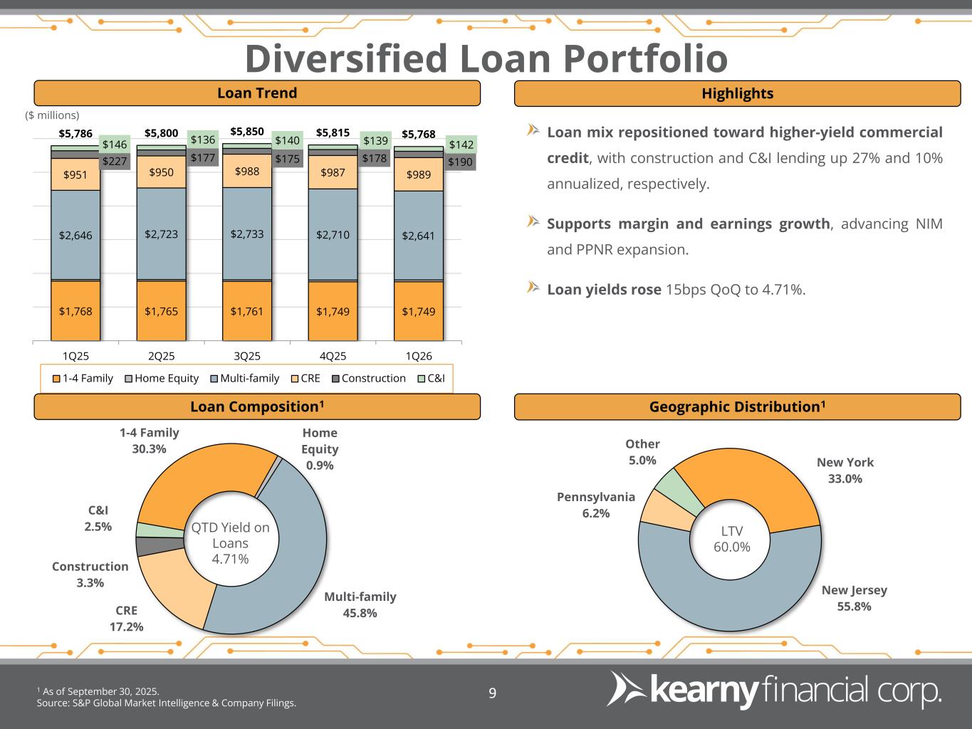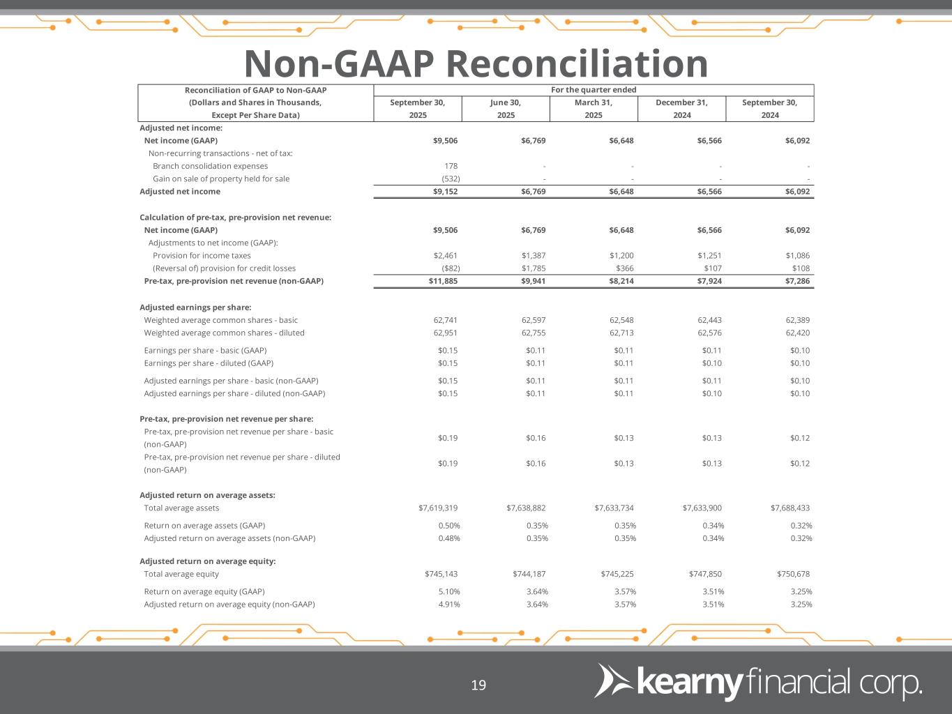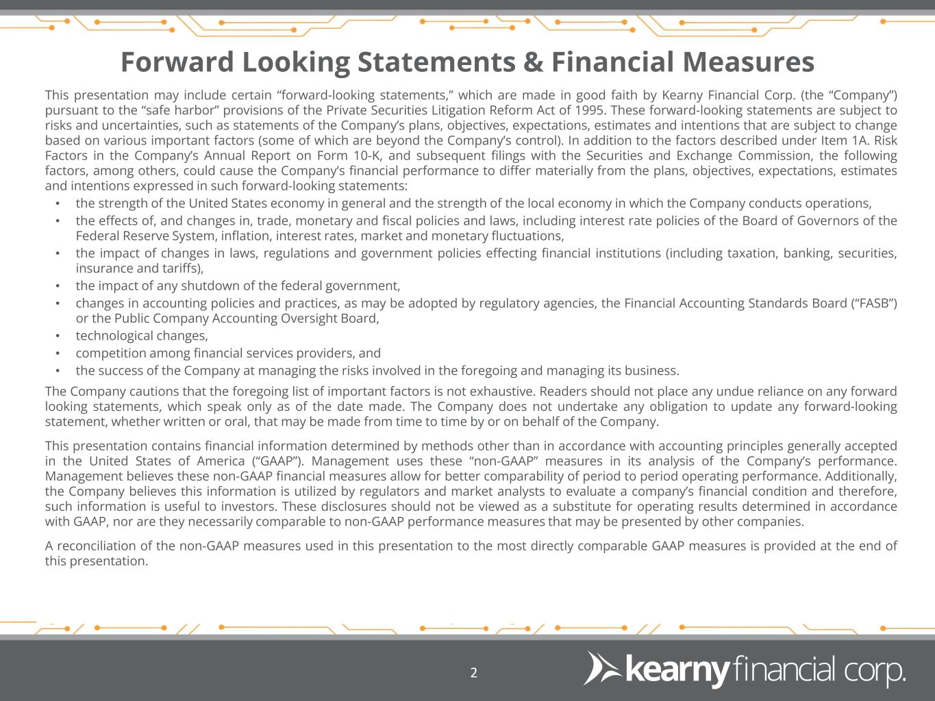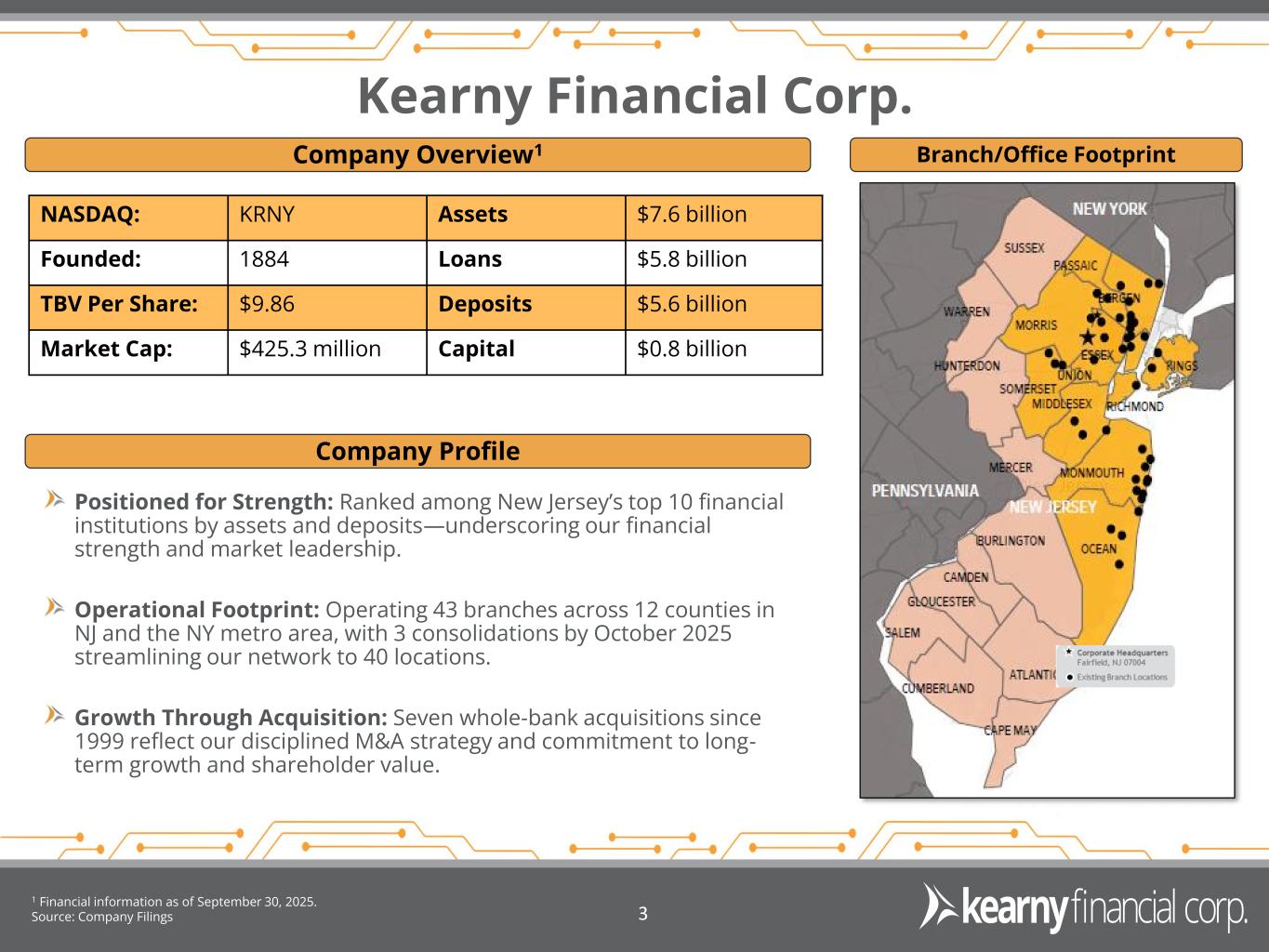 Forward Looking Statements & Financial Measures 2 This presentation may include certain “forward-looking statements,” which are made in good faith by Kearny Financial Corp. (the “Company”) pursuant to the “safe harbor” provisions of the Private Securities Litigation Reform Act of 1995. These forward-looking statements are subject to risks and uncertainties, such as statements of the Company’s plans, objectives, expectations, estimates and intentions that are subject to change based on various important factors (some of which are beyond the Company’s control). In addition to the factors described under Item 1A. Risk Factors in the Company’s Annual Report on Form 10-K, and subsequent filings with the Securities and Exchange Commission, the following factors, among others, could cause the Company’s financial performance to differ materially from the plans, objectives, expectations, estimates and intentions expressed in such forward-looking statements: • the strength of the United States economy in general and the strength of the local economy in which the Company conducts operations, • the effects of, and changes in, trade, monetary and fiscal policies and laws, including interest rate policies of the Board of Governors of the Federal Reserve System, inflation, interest rates, market and monetary fluctuations, • the impact of changes in laws, regulations and government policies effecting financial institutions (including taxation, banking, securities, insurance and tariffs), • the impact of any shutdown of the federal government, • changes in accounting policies and practices, as may be adopted by regulatory agencies, the Financial Accounting Standards Board (“FASB”) or the Public Company Accounting Oversight Board, • technological changes, • competition among financial services providers, and • the success of the Company at managing the risks involved in the foregoing and managing its business. The Company cautions that the foregoing list of important factors is not exhaustive. Readers should not place any undue reliance on any forward looking statements, which speak only as of the date made. The Company does not undertake any obligation to update any forward-looking statement, whether written or oral, that may be made from time to time by or on behalf of the Company. This presentation contains financial information determined by methods other than in accordance with accounting principles generally accepted in the United States of America (“GAAP”). Management uses these “non-GAAP” measures in its analysis of the Company’s performance. Management believes these non-GAAP financial measures allow for better comparability of period to period operating performance. Additionally, the Company believes this information is utilized by regulators and market analysts to evaluate a company’s financial condition and therefore, such information is useful to investors. These disclosures should not be viewed as a substitute for operating results determined in accordance with GAAP, nor are they necessarily comparable to non-GAAP performance measures that may be presented by other companies. A reconciliation of the non-GAAP measures used in this presentation to the most directly comparable GAAP measures is provided at the end of this presentation.