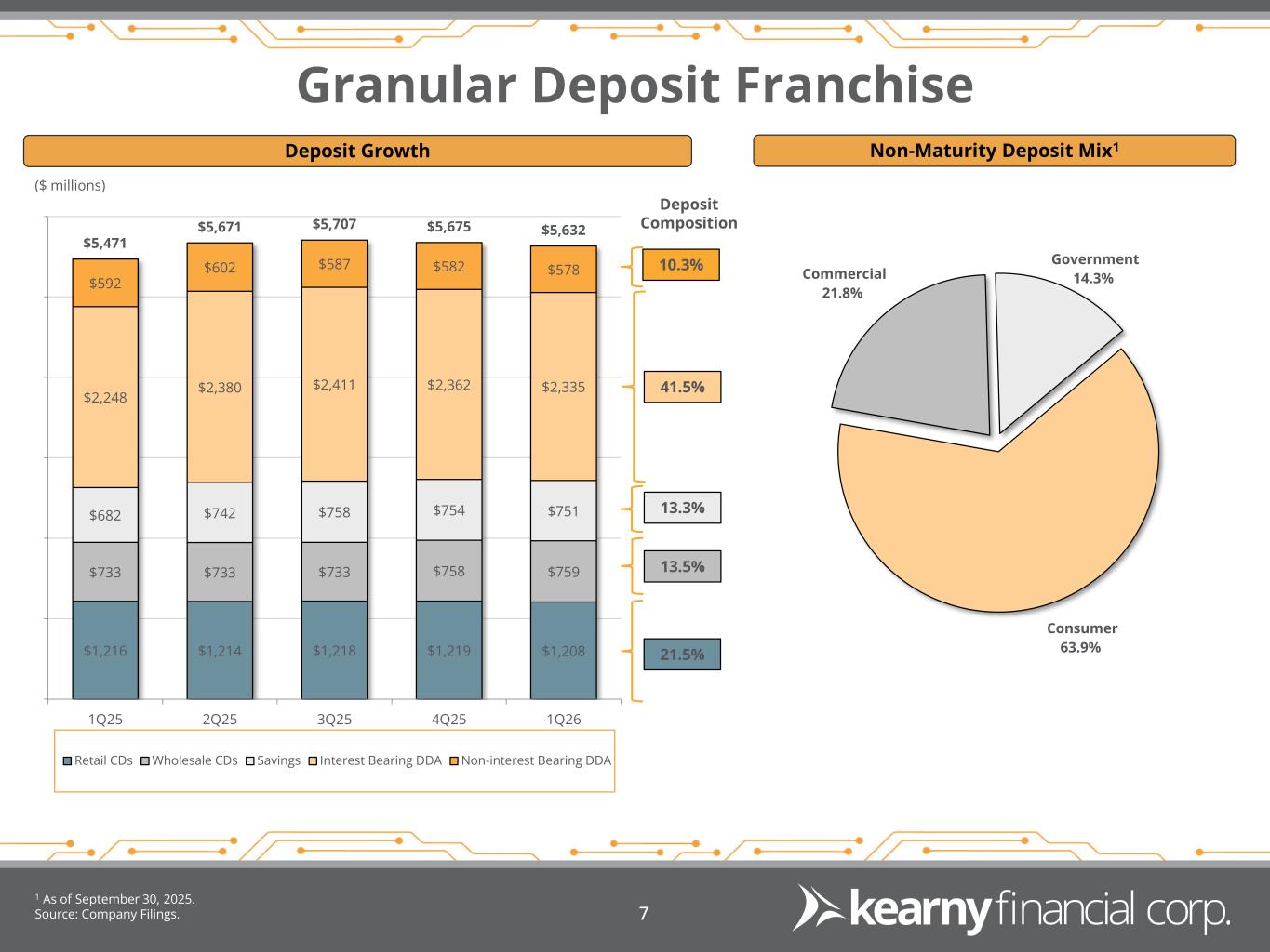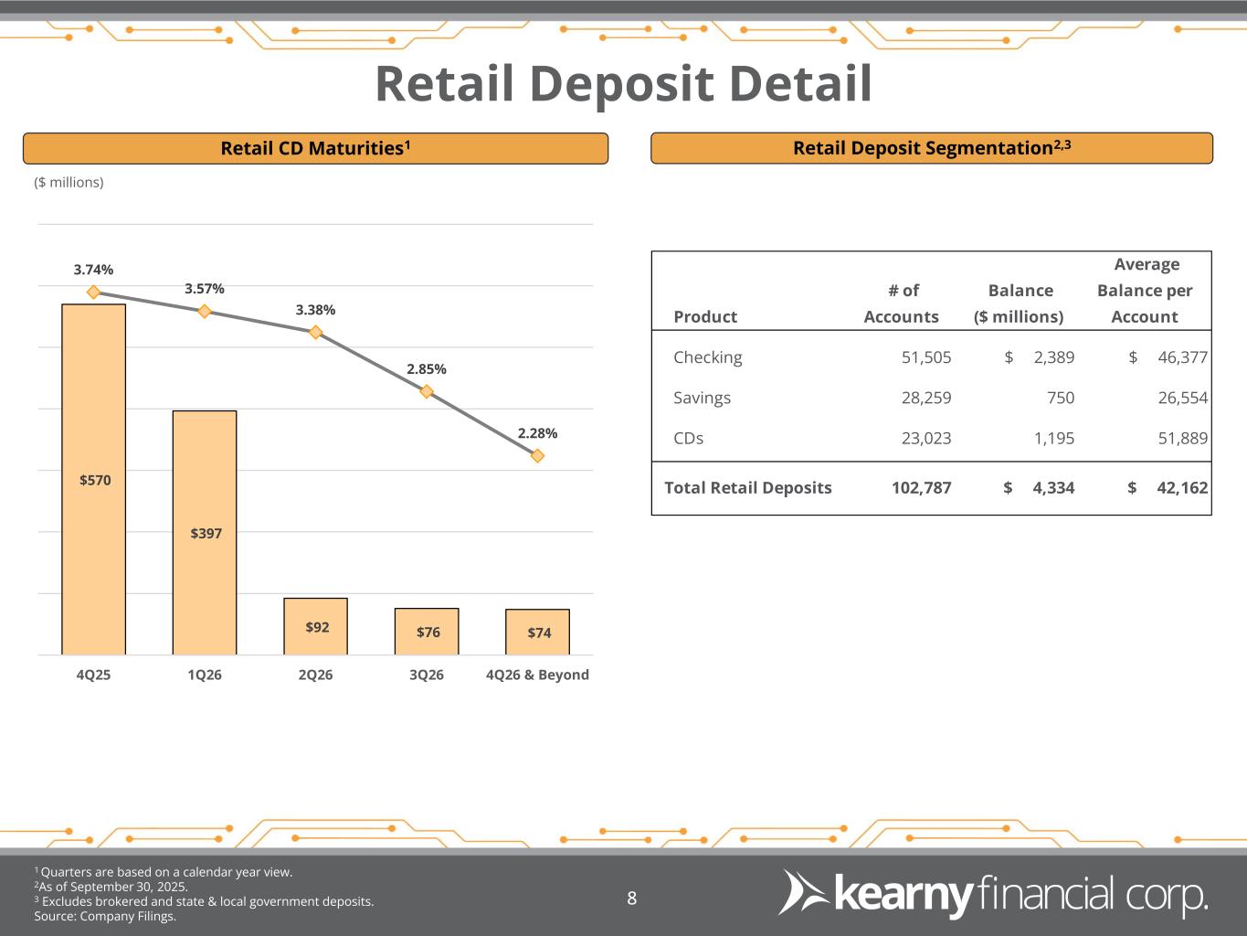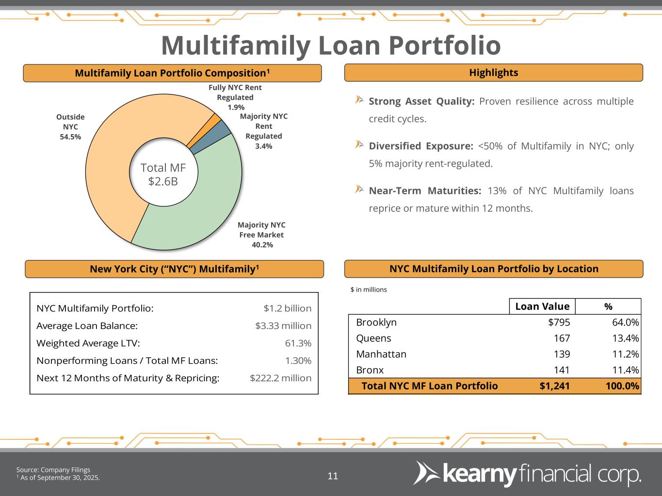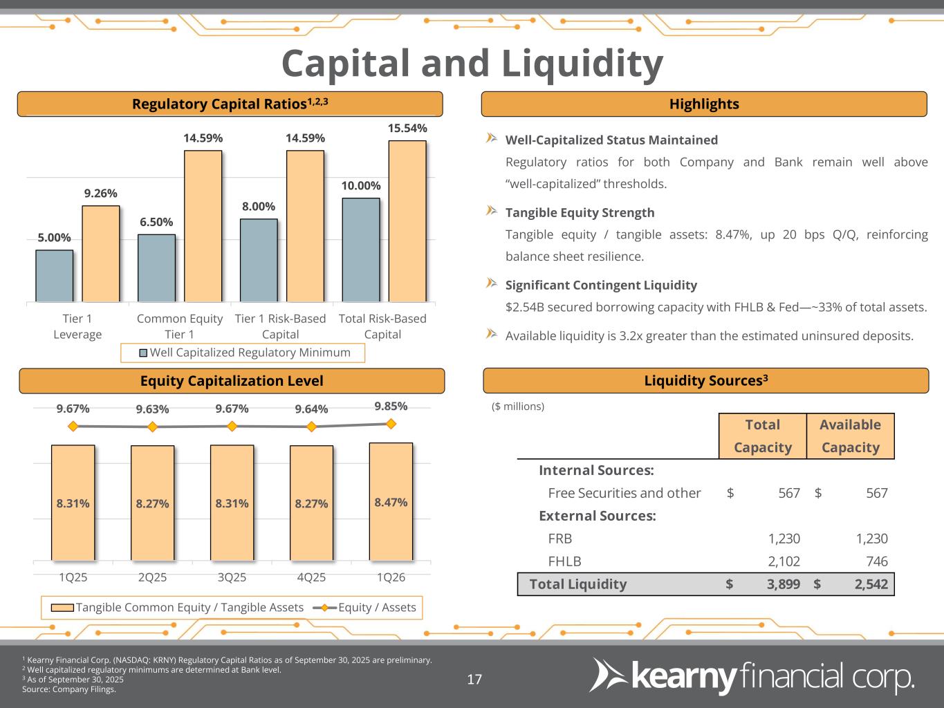 Forward Looking Statements & Financial Measures 2 This presentation may include certain “forward-looking statements,” which are made in good faith by Kearny Financial Corp. (the “Company”) pursuant to the “safe harbor” provisions of the Private Securities Litigation Reform Act of 1995. These forward-looking statements are subject to risks and uncertainties, such as statements of the Company’s plans, objectives, expectations, estimates and intentions that are subject to change based on various important factors (some of which are beyond the Company’s control). In addition to the factors described under Item 1A. Risk Factors in the Company’s Annual Report on Form 10-K, and subsequent filings with the Securities and Exchange Commission, the following factors, among others, could cause the Company’s financial performance to differ materially from the plans, objectives, expectations, estimates and intentions expressed in such forward-looking statements: • the strength of the United States economy in general and the strength of the local economy in which the Company conducts operations, • the effects of, and changes in, trade, monetary and fiscal policies and laws, including interest rate policies of the Board of Governors of the Federal Reserve System, inflation, interest rates, market and monetary fluctuations, • the impact of changes in laws, regulations and government policies effecting financial institutions (including taxation, banking, securities, insurance and tariffs), • the impact of any shutdown of the federal government, • changes in accounting policies and practices, as may be adopted by regulatory agencies, the Financial Accounting Standards Board (“FASB”) or the Public Company Accounting Oversight Board, • technological changes, • competition among financial services providers, and • the success of the Company at managing the risks involved in the foregoing and managing its business. The Company cautions that the foregoing list of important factors is not exhaustive. Readers should not place any undue reliance on any forward looking statements, which speak only as of the date made. The Company does not undertake any obligation to update any forward-looking statement, whether written or oral, that may be made from time to time by or on behalf of the Company. This presentation contains financial information determined by methods other than in accordance with accounting principles generally accepted in the United States of America (“GAAP”). Management uses these “non-GAAP” measures in its analysis of the Company’s performance. Management believes these non-GAAP financial measures allow for better comparability of period to period operating performance. Additionally, the Company believes this information is utilized by regulators and market analysts to evaluate a company’s financial condition and therefore, such information is useful to investors. These disclosures should not be viewed as a substitute for operating results determined in accordance with GAAP, nor are they necessarily comparable to non-GAAP performance measures that may be presented by other companies. A reconciliation of the non-GAAP measures used in this presentation to the most directly comparable GAAP measures is provided at the end of this presentation.