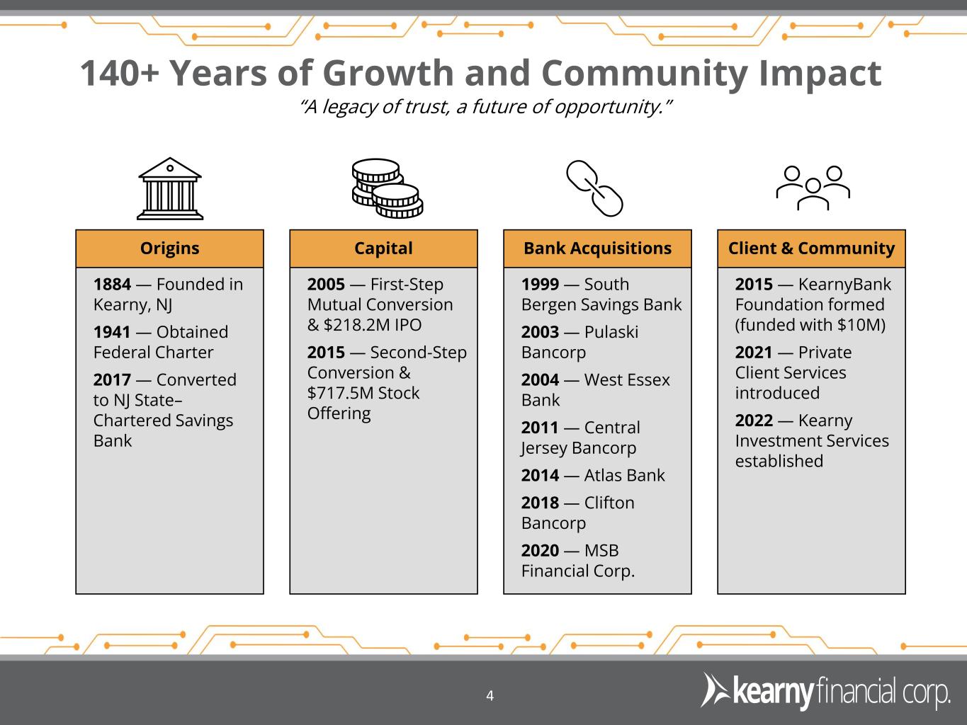Kearny Financial Corp. 1 As of June 30, 2024 2 As of June 30, 2024 Source: S&P Global Market Intelligence & Company Filings 3 Branch/Office Footprint 1 Financial information as of September 30, 2025. Source: Company Filings 3 NASDAQ: KRNY Assets $7.6 billion Founded: 1884 Loans $5.8 billion TBV Per Share: $9.86 Deposits $5.6 billion Market Cap: $425.3 million Capital $0.8 billion Positioned for Strength: Ranked among New Jersey’s top 10 financial institutions by assets and deposits—underscoring our financial strength and market leadership. Operational Footprint: Operating 43 branches across 12 counties in NJ and the NY metro area, with 3 consolidations by October 2025 streamlining our network to 40 locations. Growth Through Acquisition: Seven whole-bank acquisitions since 1999 reflect our disciplined M&A strategy and commitment to long- term growth and shareholder value. Company Overview1 Company Profile