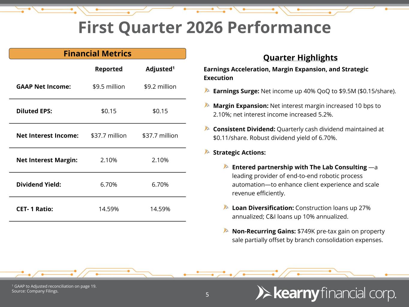 4 4 Origins 1884 — Founded in Kearny, NJ 1941 — Obtained Federal Charter 2017 — Converted to NJ State– Chartered Savings Bank Capital 2005 — First-Step Mutual Conversion & $218.2M IPO 2015 — Second-Step Conversion & $717.5M Stock Offering Bank Acquisitions 1999 — South Bergen Savings Bank 2003 — Pulaski Bancorp 2004 — West Essex Bank 2011 — Central Jersey Bancorp 2014 — Atlas Bank 2018 — Clifton Bancorp 2020 — MSB Financial Corp. Client & Community 2015 — KearnyBank Foundation formed (funded with $10M) 2021 — Private Client Services introduced 2022 — Kearny Investment Services established 140+ Years of Growth and Community Impact “A legacy of trust, a future of opportunity.”