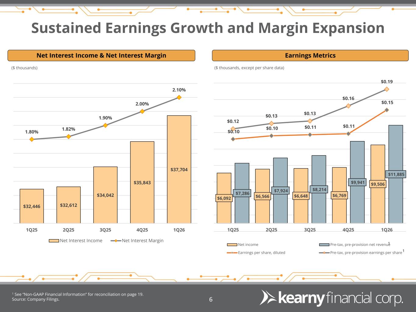 First Quarter 2026 Performance 1 GAAP to Adjusted reconciliation on page 19. Source: Company Filings. 5 Quarter Highlights Earnings Acceleration, Margin Expansion, and Strategic Execution Earnings Surge: Net income up 40% QoQ to $9.5M ($0.15/share). Margin Expansion: Net interest margin increased 10 bps to 2.10%; net interest income increased 5.2%. Consistent Dividend: Quarterly cash dividend maintained at $0.11/share. Robust dividend yield of 6.70%. Strategic Actions: Entered partnership with The Lab Consulting —a leading provider of end-to-end robotic process automation—to enhance client experience and scale revenue efficiently. Loan Diversification: Construction loans up 27% annualized; C&I loans up 10% annualized. Non-Recurring Gains: $749K pre-tax gain on property sale partially offset by branch consolidation expenses. Reported Adjusted1 GAAP Net Income: $9.5 million $9.2 million Diluted EPS: $0.15 $0.15 Net Interest Income: $37.7 million $37.7 million Net Interest Margin: 2.10% 2.10% Dividend Yield: 6.70% 6.70% CET- 1 Ratio: 14.59% 14.59% Financial Metrics