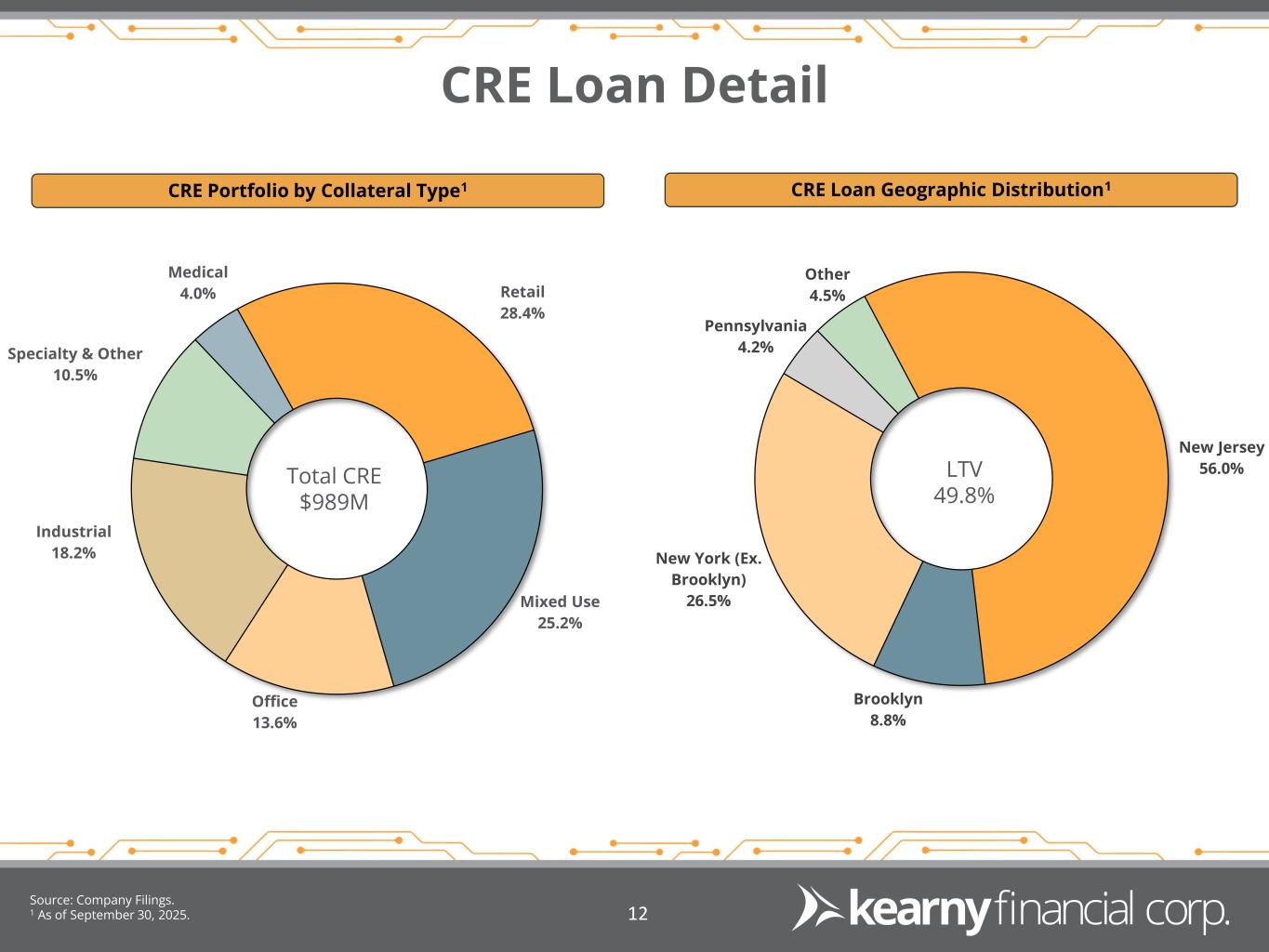 Multifamily Loan Portfolio Multifamily Loan Portfolio Composition1 Source: Company Filings 1 As of September 30, 2025. 11 NYC Multifamily Loan Portfolio by Location Strong Asset Quality: Proven resilience across multiple credit cycles. Diversified Exposure: <50% of Multifamily in NYC; only 5% majority rent-regulated. Near-Term Maturities: 13% of NYC Multifamily loans reprice or mature within 12 months. Majority NYC Free Market 40.2% Outside NYC 54.5% Fully NYC Rent Regulated 1.9% Majority NYC Rent Regulated 3.4% Total MF $2.6B NYC Multifamily Portfolio: $1.2 billion Average Loan Balance: $3.33 million Weighted Average LTV: 61.3% Nonperforming Loans / Total MF Loans: 1.30% Next 12 Months of Maturity & Repricing: $222.2 million New York City (“NYC”) Multifamily1 Highlights Loan Value % Brooklyn $795 64.0% Queens 167 13.4% Manhattan 139 11.2% Bronx 141 11.4% Total NYC MF Loan Portfolio $1,241 100.0% $ in millions
