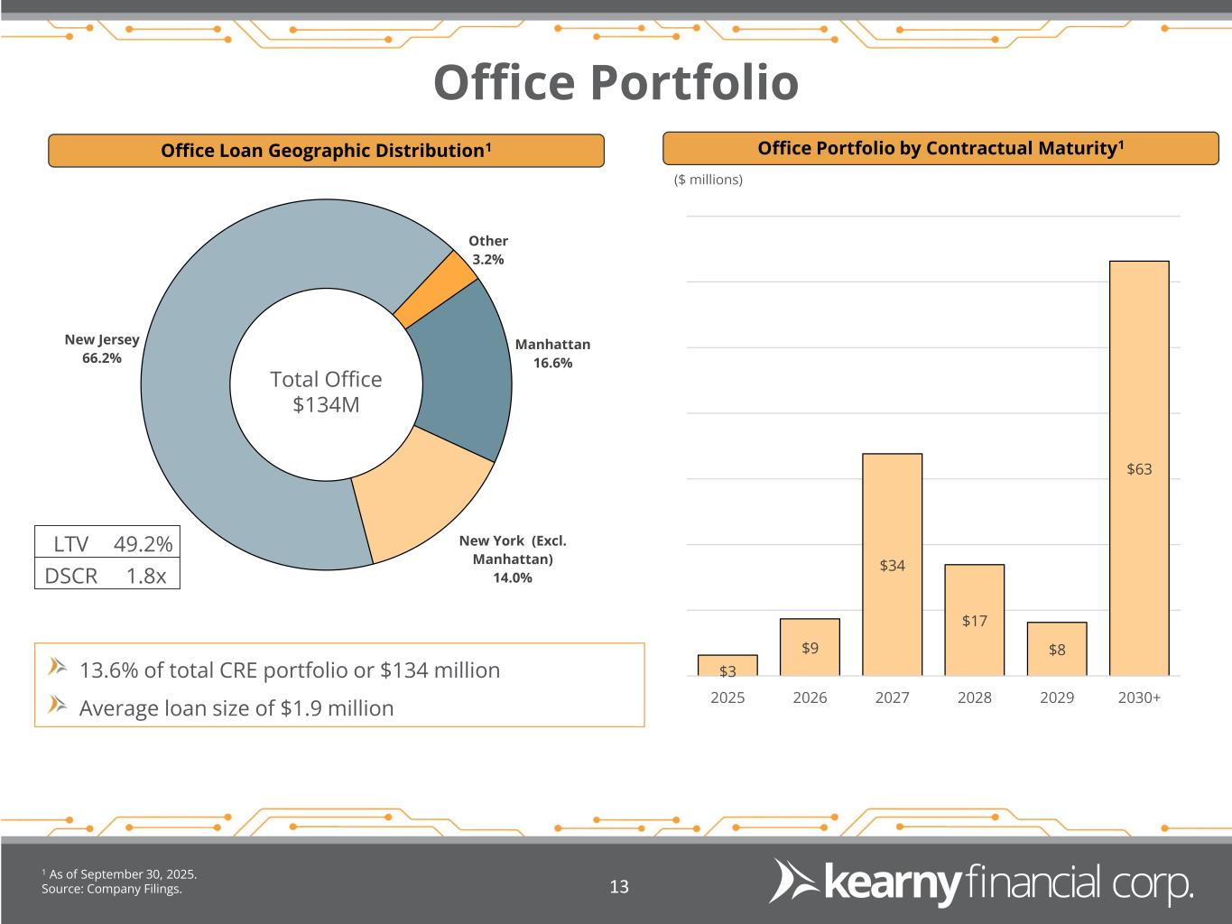 CRE Loan Detail Source: Company Filings. 1 As of September 30, 2025. 12 Retail 28.4% Mixed Use 25.2% Office 13.6% Industrial 18.2% Specialty & Other 10.5% Medical 4.0% Total CRE $989M New Jersey 56.0% Brooklyn 8.8% New York (Ex. Brooklyn) 26.5% Pennsylvania 4.2% Other 4.5% LTV 49.8% CRE Portfolio by Collateral Type1 CRE Loan Geographic Distribution1