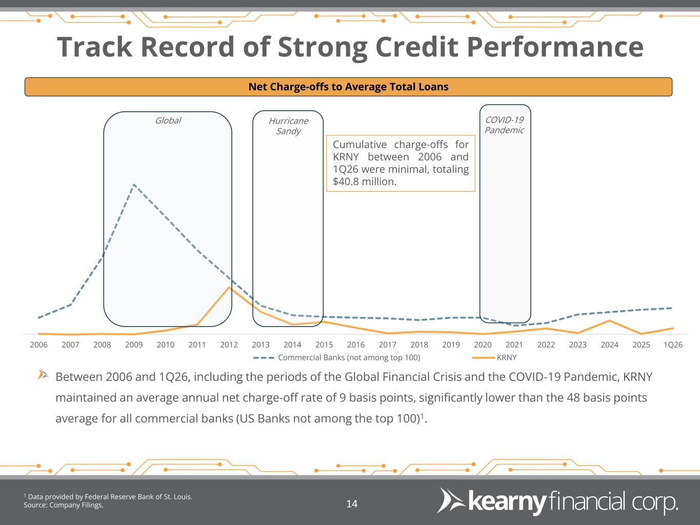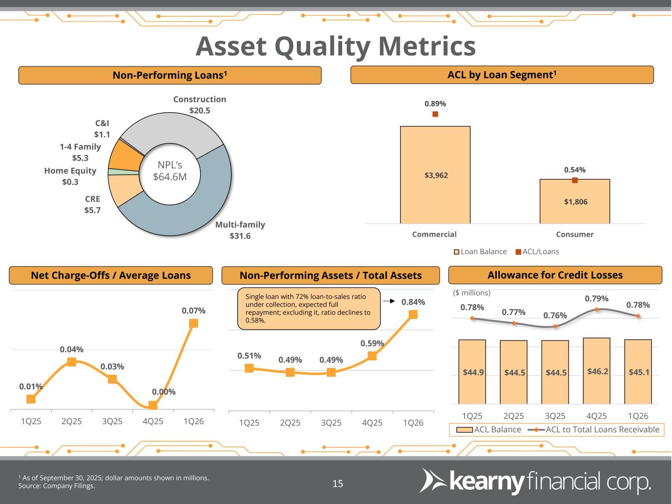 Track Record of Strong Credit Performance 1 Data provided by Federal Reserve Bank of St. Louis. Source: Company Filings. 14 Net Charge-offs to Average Total Loans Between 2006 and 1Q26, including the periods of the Global Financial Crisis and the COVID-19 Pandemic, KRNY maintained an average annual net charge-off rate of 9 basis points, significantly lower than the 48 basis points average for all commercial banks (US Banks not among the top 100)1. Cumulative charge-offs for KRNY between 2006 and 1Q26 were minimal, totaling $40.8 million. 2006 2007 2008 2009 2010 2011 2012 2013 2014 2015 2016 2017 2018 2019 2020 2021 2022 2023 2024 2025 1Q26 Commercial Banks (not among top 100) KRNY Global Hurricane Sandy COVID-19 Pandemic
