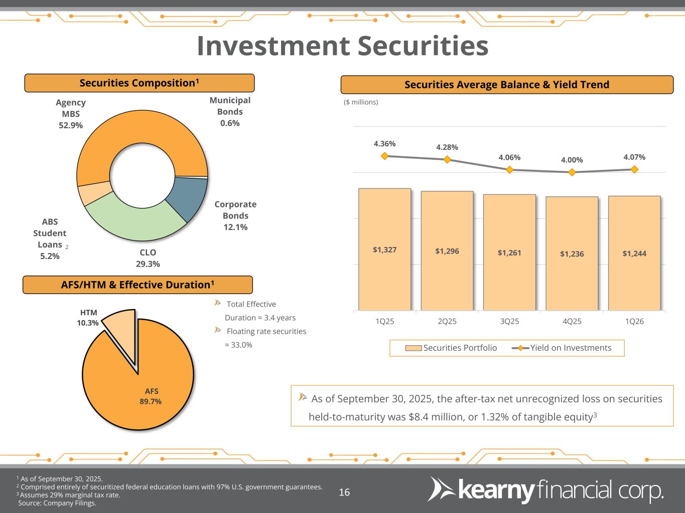 Asset Quality Metrics Non-Performing Assets / Total Assets 1 As of September 30, 2025; dollar amounts shown in millions. Source: Company Filings. 15 Net Charge-Offs / Average Loans Non-Performing Loans1 0.01% 0.04% 0.03% 0.00% 0.07% 1Q25 2Q25 3Q25 4Q25 1Q26 0.51% 0.49% 0.49% 0.59% 0.84% 1Q25 2Q25 3Q25 4Q25 1Q26 Allowance for Credit Losses ACL by Loan Segment1 $3,962 $1,806 0.89% 0.54% Commercial Consumer Loan Balance ACL/Loans $44.9 $44.5 $44.5 $46.2 $45.1 0.78% 0.77% 0.76% 0.79% 0.78% 1Q25 2Q25 3Q25 4Q25 1Q26 ACL Balance ACL to Total Loans Receivable Multi-family $31.6 CRE $5.7 C&I $1.1 1-4 Family $5.3 Home Equity $0.3 Construction $20.5 NPL’s $64.6M Single loan with 72% loan-to-sales ratio under collection, expected full repayment; excluding it, ratio declines to 0.58%. ($ millions)