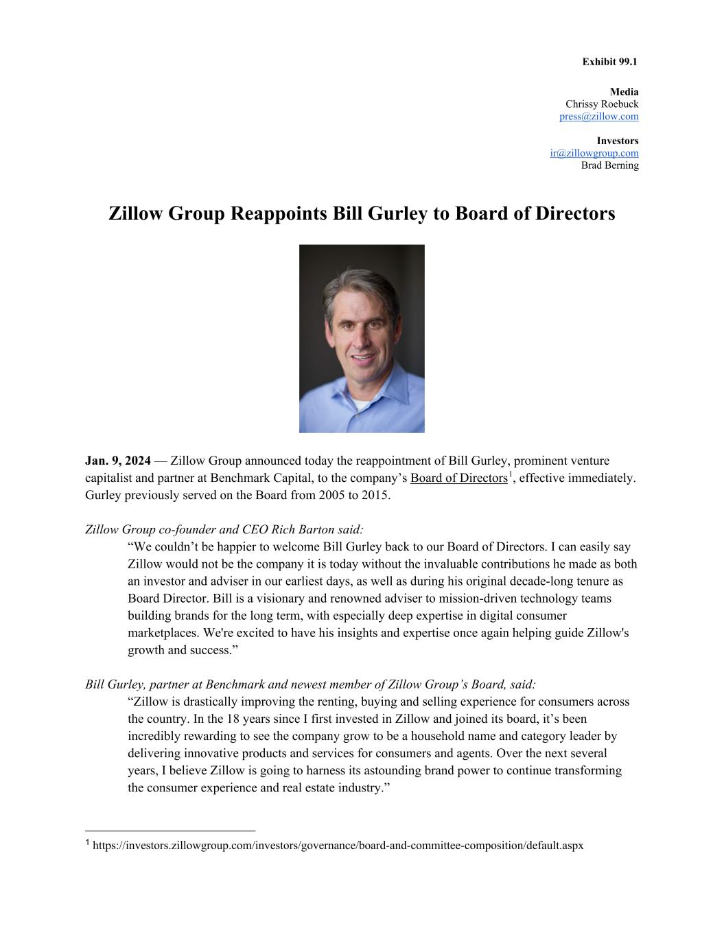 Media Chrissy Roebuck press@zillow.com Investors ir@zillowgroup.com Brad Berning Zillow Group Reappoints Bill Gurley to Board of Directors Jan. 9, 2024 — Zillow Group announced today the reappointment of Bill Gurley, prominent venture capitalist and partner at Benchmark Capital, to the company’s Board of Directors1, effective immediately. Gurley previously served on the Board from 2005 to 2015. Zillow Group co-founder and CEO Rich Barton said: “We couldn’t be happier to welcome Bill Gurley back to our Board of Directors. I can easily say Zillow would not be the company it is today without the invaluable contributions he made as both an investor and adviser in our earliest days, as well as during his original decade-long tenure as Board Director. Bill is a visionary and renowned adviser to mission-driven technology teams building brands for the long term, with especially deep expertise in digital consumer marketplaces. We're excited to have his insights and expertise once again helping guide Zillow's growth and success.” Bill Gurley, partner at Benchmark and newest member of Zillow Group’s Board, said: “Zillow is drastically improving the renting, buying and selling experience for consumers across the country. In the 18 years since I first invested in Zillow and joined its board, it’s been incredibly rewarding to see the company grow to be a household name and category leader by delivering innovative products and services for consumers and agents. Over the next several years, I believe Zillow is going to harness its astounding brand power to continue transforming the consumer experience and real estate industry.” 1 https://investors.zillowgroup.com/investors/governance/board-and-committee-composition/default.aspx Exhibit 99.1