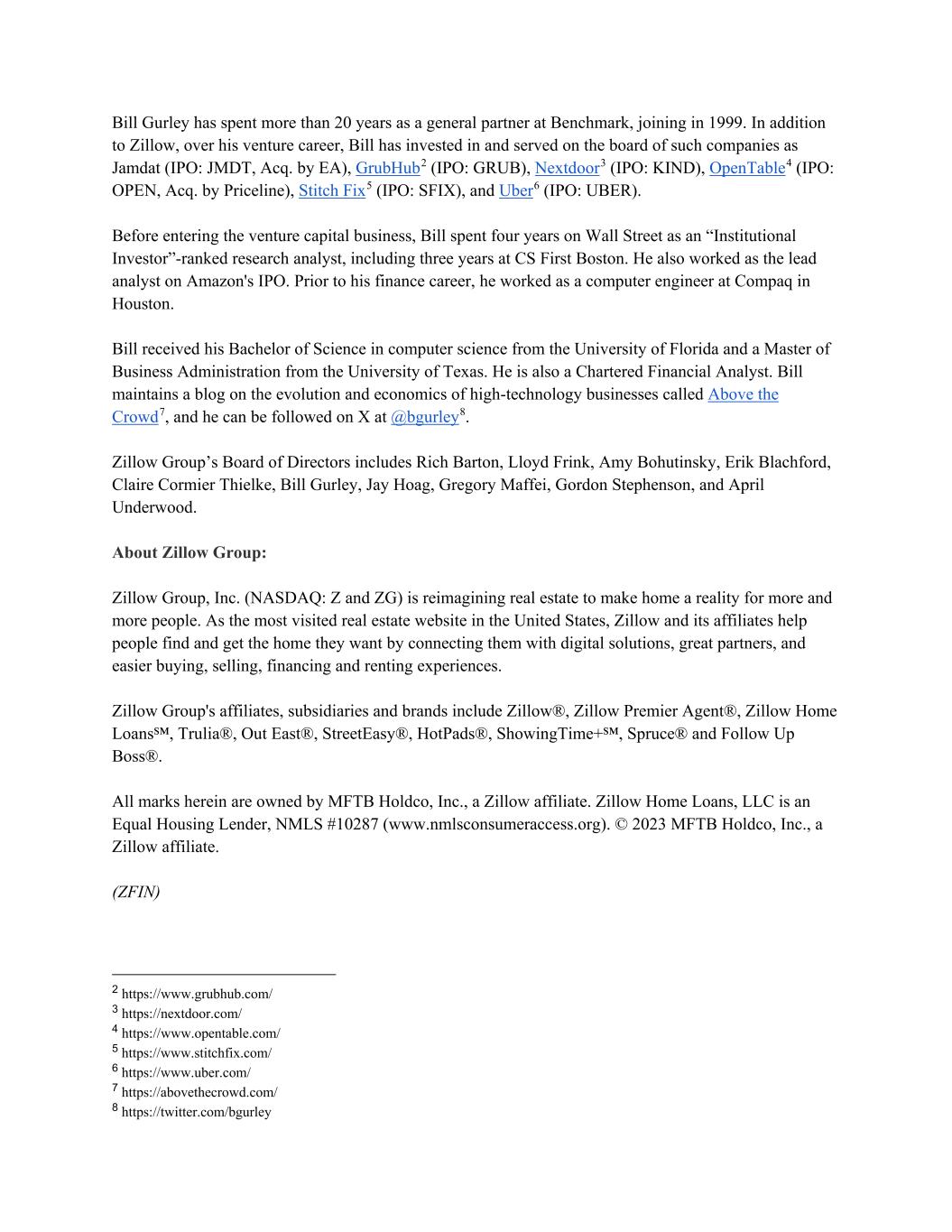 Bill Gurley has spent more than 20 years as a general partner at Benchmark, joining in 1999. In addition to Zillow, over his venture career, Bill has invested in and served on the board of such companies as Jamdat (IPO: JMDT, Acq. by EA), GrubHub2 (IPO: GRUB), Nextdoor3 (IPO: KIND), OpenTable4 (IPO: OPEN, Acq. by Priceline), Stitch Fix5 (IPO: SFIX), and Uber6 (IPO: UBER). Before entering the venture capital business, Bill spent four years on Wall Street as an “Institutional Investor”-ranked research analyst, including three years at CS First Boston. He also worked as the lead analyst on Amazon's IPO. Prior to his finance career, he worked as a computer engineer at Compaq in Houston. Bill received his Bachelor of Science in computer science from the University of Florida and a Master of Business Administration from the University of Texas. He is also a Chartered Financial Analyst. Bill maintains a blog on the evolution and economics of high-technology businesses called Above the Crowd7, and he can be followed on X at @bgurley8. Zillow Group’s Board of Directors includes Rich Barton, Lloyd Frink, Amy Bohutinsky, Erik Blachford, Claire Cormier Thielke, Bill Gurley, Jay Hoag, Gregory Maffei, Gordon Stephenson, and April Underwood. About Zillow Group: Zillow Group, Inc. (NASDAQ: Z and ZG) is reimagining real estate to make home a reality for more and more people. As the most visited real estate website in the United States, Zillow and its affiliates help people find and get the home they want by connecting them with digital solutions, great partners, and easier buying, selling, financing and renting experiences. Zillow Group's affiliates, subsidiaries and brands include Zillow®, Zillow Premier Agent®, Zillow Home Loans℠, Trulia®, Out East®, StreetEasy®, HotPads®, ShowingTime+℠, Spruce® and Follow Up Boss®. All marks herein are owned by MFTB Holdco, Inc., a Zillow affiliate. Zillow Home Loans, LLC is an Equal Housing Lender, NMLS #10287 (www.nmlsconsumeraccess.org). © 2023 MFTB Holdco, Inc., a Zillow affiliate. (ZFIN) 2 https://www.grubhub.com/ 3 https://nextdoor.com/ 4 https://www.opentable.com/ 5 https://www.stitchfix.com/ 6 https://www.uber.com/ 7 https://abovethecrowd.com/ 8 https://twitter.com/bgurley
