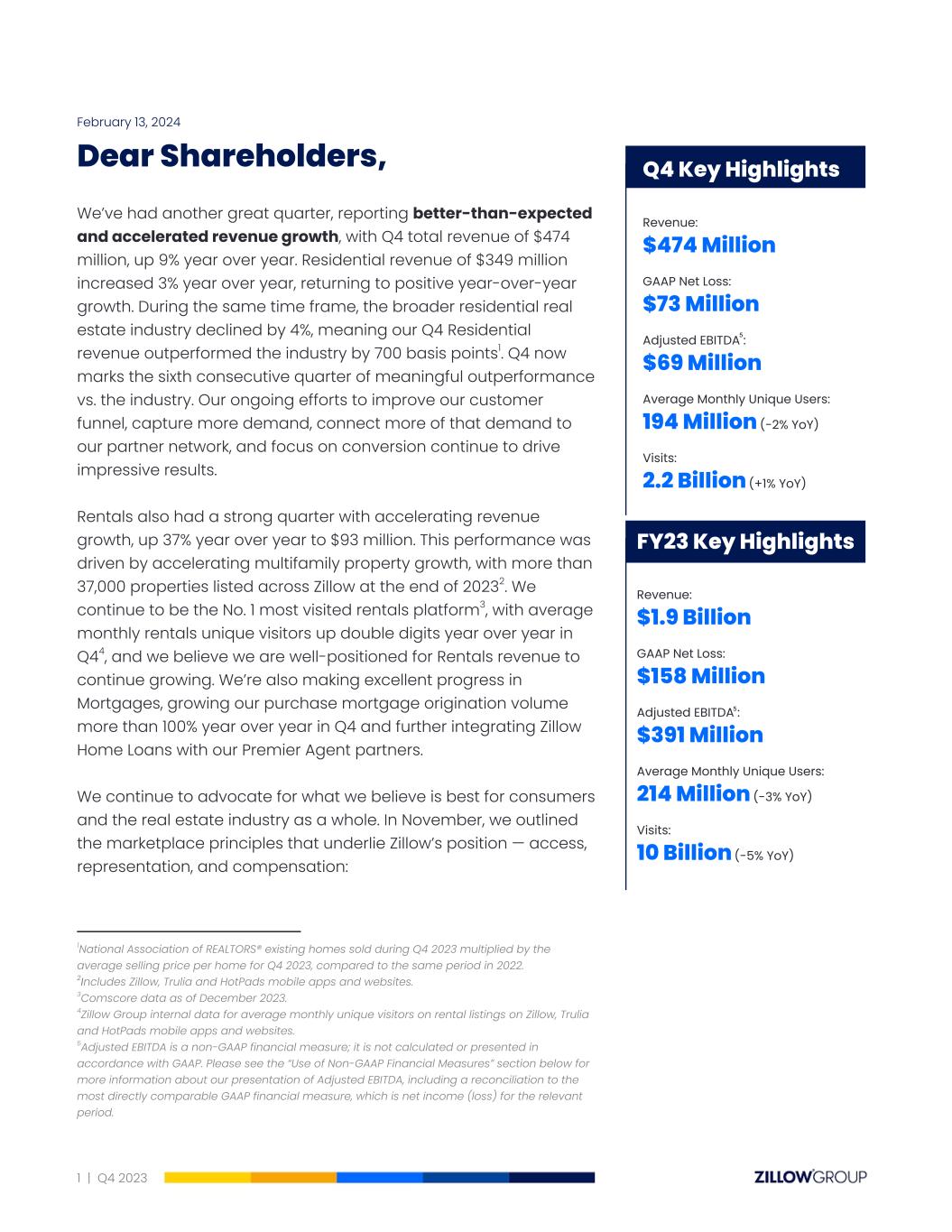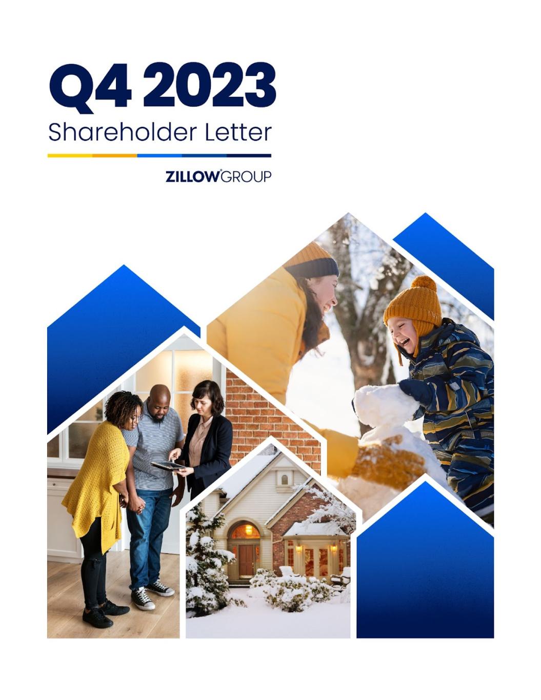 February 13, 2024 Dear Shareholders, We’ve had another great quarter, reporting better-than-expected and accelerated revenue growth , with Q4 total revenue of $474 million, up 9% year over year. Residential revenue of $349 million increased 3% year over year, returning to positive year-over-year growth. During the same time frame, the broader residential real estate industry declined by 4%, meaning our Q4 Residential revenue outperformed the industry by 700 basis points 1 . Q4 now marks the sixth consecutive quarter of meaningful outperformance vs. the industry. Our ongoing efforts to improve our customer funnel, capture more demand, connect more of that demand to our partner network, and focus on conversion continue to drive impressive results. Rentals also had a strong quarter with accelerating revenue growth, up 37% year over year to $93 million. This performance was driven by accelerating multifamily property growth, with more than 37,000 properties listed across Zillow at the end of 2023 2 . We continue to be the No. 1 most visited rentals platform 3 , with average monthly rentals unique visitors up double digits year over year in Q4 4 , and we believe we are well-positioned for Rentals revenue to continue growing. We’re also making excellent progress in Mortgages, growing our purchase mortgage origination volume more than 100% year over year in Q4 and further integrating Zillow Home Loans with our Premier Agent partners. We continue to advocate for what we believe is best for consumers and the real estate industry as a whole. In November, we outlined the marketplace principles that underlie Zillow’s position — access, representation, and compensation: 5 5 Adjusted EBITDA is a non-GAAP financial measure; it is not calculated or presented in accordance with GAAP. Please see the “Use of Non-GAAP Financial Measures” section below for more information about our presentation of Adjusted EBITDA, including a reconciliation to the most directly comparable GAAP financial measure, which is net income (loss) for the relevant period. 4 Zillow Group internal data for average monthly unique visitors on rental listings on Zillow, Trulia and HotPads mobile apps and websites. 3 Comscore data as of December 2023. 2 I ncludes Zillow, Trulia and HotPads mobile apps and websites. 1 National Association of REALTORS® existing homes sold during Q4 2023 multiplied by the average selling price per home for Q4 2023, compared to the same period in 2022. 1 | Q4 2023