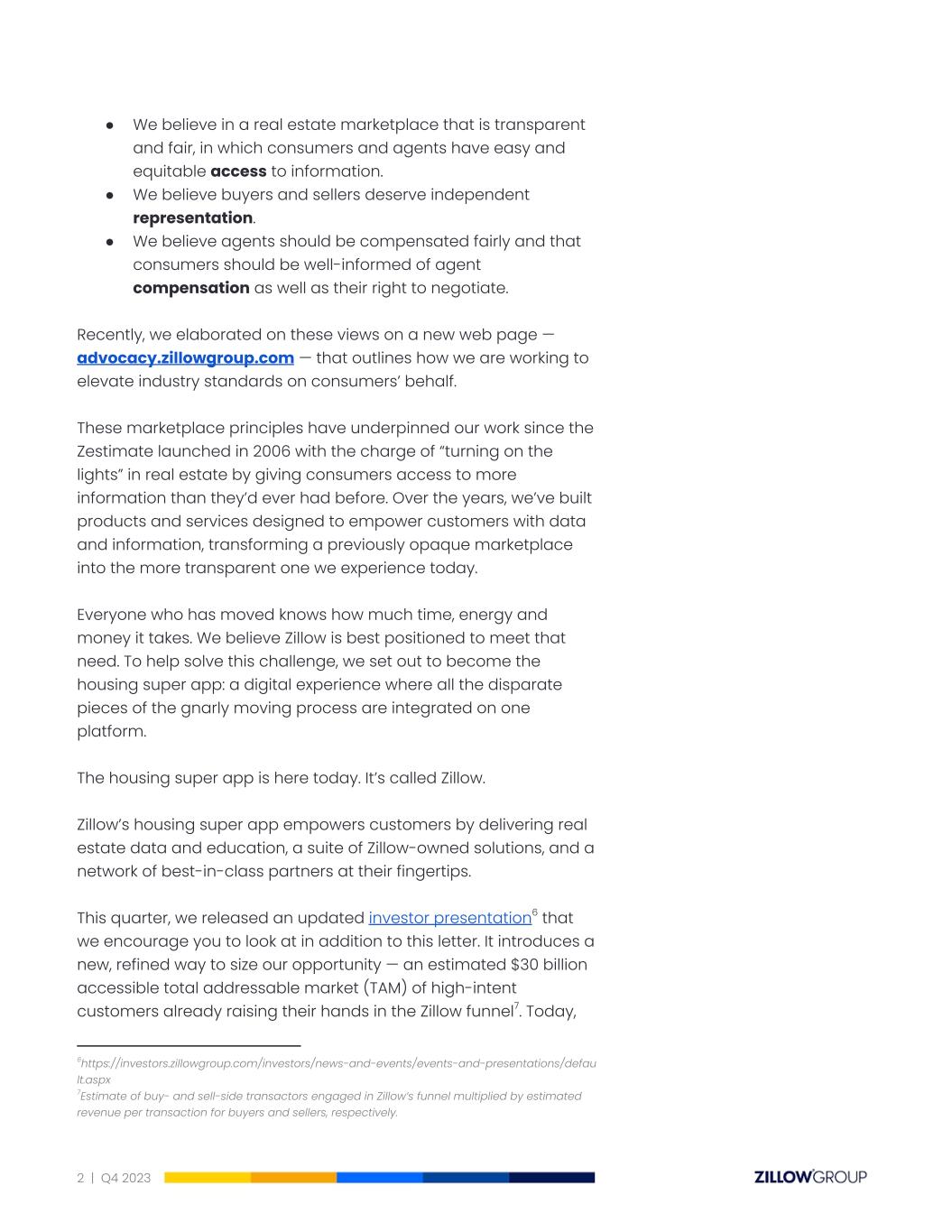 ● We believe in a real estate marketplace that is transparent and fair, in which consumers and agents have easy and equitable access to information. ● We believe buyers and sellers deserve independent representation . ● We believe agents should be compensated fairly and that consumers should be well-informed of agent compensation as well as their right to negotiate. Recently, we elaborated on these views on a new web page — advocacy.zillowgroup.com — that outlines how we are working to elevate industry standards on consumers’ behalf. These marketplace principles have underpinned our work since the Zestimate launched in 2006 with the charge of “turning on the lights” in real estate by giving consumers access to more information than they’d ever had before. Over the years, we’ve built products and services designed to empower customers with data and information, transforming a previously opaque marketplace into the more transparent one we experience today. Everyone who has moved knows how much time, energy and money it takes. We believe Zillow is best positioned to meet that need. To help solve this challenge, we set out to become the housing super app: a digital experience where all the disparate pieces of the gnarly moving process are integrated on one platform. The housing super app is here today. It’s called Zillow. Zillow’s housing super app empowers customers by delivering real estate data and education, a suite of Zillow-owned solutions, and a network of best-in-class partners at their fingertips. This quarter, we released an updated investor presentation 6 that we encourage you to look at in addition to this letter. It introduces a new, refined way to size our opportunity — an estimated $30 billion accessible total addressable market (TAM) of high-intent customers already raising their hands in the Zillow funnel 7 . Today, 7 Estimate of buy- and sell-side transactors engaged in Zillow’s funnel multiplied by estimated revenue per transaction for buyers and sellers, respectively. 6 https://investors.zillowgroup.com/investors/news-and-events/events-and-presentations/defau lt.aspx 2 | Q4 2023