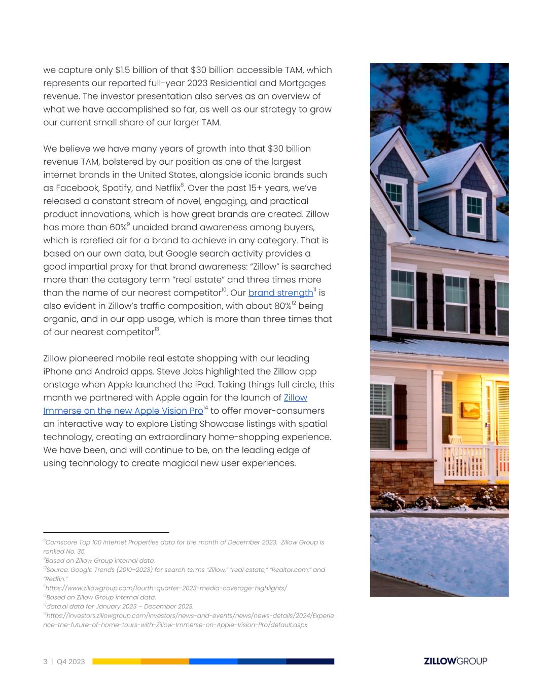 we capture only $1.5 billion of that $30 billion accessible TAM, which represents our reported full-year 2023 Residential and Mortgages revenue. The investor presentation also serves as an overview of what we have accomplished so far, as well as our strategy to grow our current small share of our larger TAM. We believe we have many years of growth into that $30 billion revenue TAM, bolstered by our position as one of the largest internet brands in the United States, alongside iconic brands such as Facebook, Spotify, and Netflix 8 . Over the past 15+ years, we’ve released a constant stream of novel, engaging, and practical product innovations, which is how great brands are created. Zillow has more than 60% 9 unaided brand awareness among buyers, which is rarefied air for a brand to achieve in any category. That is based on our own data, but Google search activity provides a good impartial proxy for that brand awareness: “Zillow” is searched more than the category term “real estate” and three times more than the name of our nearest competitor 10 . Our brand strength 11 is also evident in Zillow’s traffic composition, with about 80% 12 being organic, and in our app usage, which is more than three times that of our nearest competitor 13 . Zillow pioneered mobile real estate shopping with our leading iPhone and Android apps. Steve Jobs highlighted the Zillow app onstage when Apple launched the iPad. Taking things full circle, this month we partnered with Apple again for the launch of Zillow Immerse on the new Apple Vision Pro 14 to offer mover-consumers an interactive way to explore Listing Showcase listings with spatial technology, creating an extraordinary home-shopping experience. We have been, and will continue to be, on the leading edge of using technology to create magical new user experiences. 14 https://investors.zillowgroup.com/investors/news-and-events/news/news-details/2024/Experie nce-the-future-of-home-tours-with-Zillow-Immerse-on-Apple-Vision-Pro/default.aspx 13 data.ai data for January 2023 – December 2023. 12 Based on Zillow Group internal data . 11 https://www.zillowgroup.com/fourth-quarter-2023-media-coverage-highlights/ 10 Source: Google Trends (2010–2023) for search terms “Zillow,” “real estate,” “Realtor.com,” and “Redfin.” 9 Based on Zillow Group internal data. 8 Comscore Top 100 Internet Properties data for the month of December 2023. Zillow Group is ranked No. 35. 3 | Q4 2023