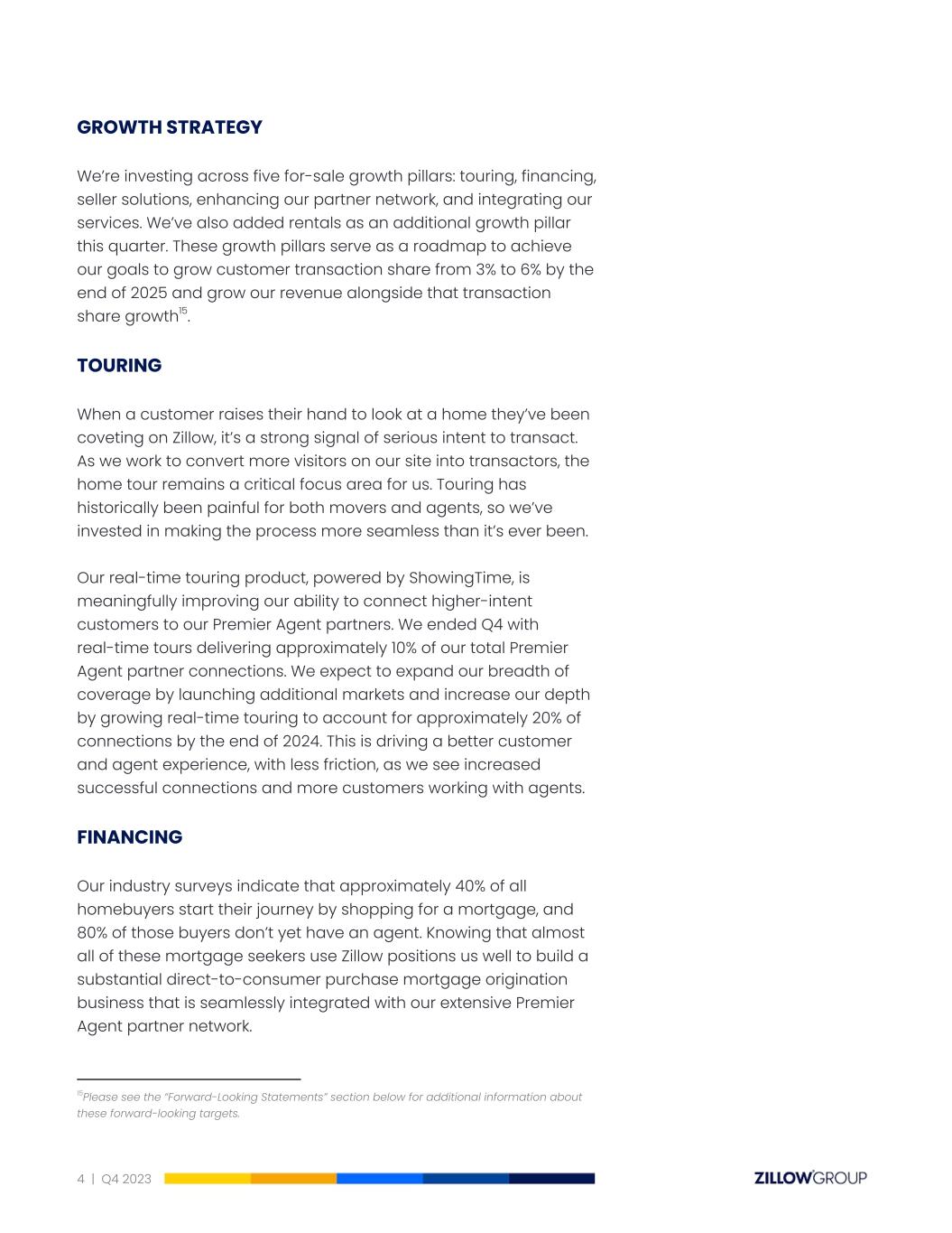 GROWTH STRATEGY We’re investing across five for-sale growth pillars: touring, financing, seller solutions, enhancing our partner network, and integrating our services. We’ve also added rentals as an additional growth pillar this quarter. These growth pillars serve as a roadmap to achieve our goals to grow customer transaction share from 3% to 6% by the end of 2025 and grow our revenue alongside that transaction share growth 15 . TOURING When a customer raises their hand to look at a home they’ve been coveting on Zillow, it’s a strong signal of serious intent to transact. As we work to convert more visitors on our site into transactors, the home tour remains a critical focus area for us. Touring has historically been painful for both movers and agents, so we’ve invested in making the process more seamless than it’s ever been. Our real-time touring product, powered by ShowingTime, is meaningfully improving our ability to connect higher-intent customers to our Premier Agent partners. We ended Q4 with real-time tours delivering approximately 10% of our total Premier Agent partner connections. We expect to expand our breadth of coverage by launching additional markets and increase our depth by growing real-time touring to account for approximately 20% of connections by the end of 2024. This is driving a better customer and agent experience, with less friction, as we see increased successful connections and more customers working with agents. FINANCING Our industry surveys indicate that approximately 40% of all homebuyers start their journey by shopping for a mortgage, and 80% of those buyers don’t yet have an agent. Knowing that almost all of these mortgage seekers use Zillow positions us well to build a substantial direct-to-consumer purchase mortgage origination business that is seamlessly integrated with our extensive Premier Agent partner network. 15 Please see the “Forward-Looking Statements” section below for additional information about these forward-looking targets. 4 | Q4 2023