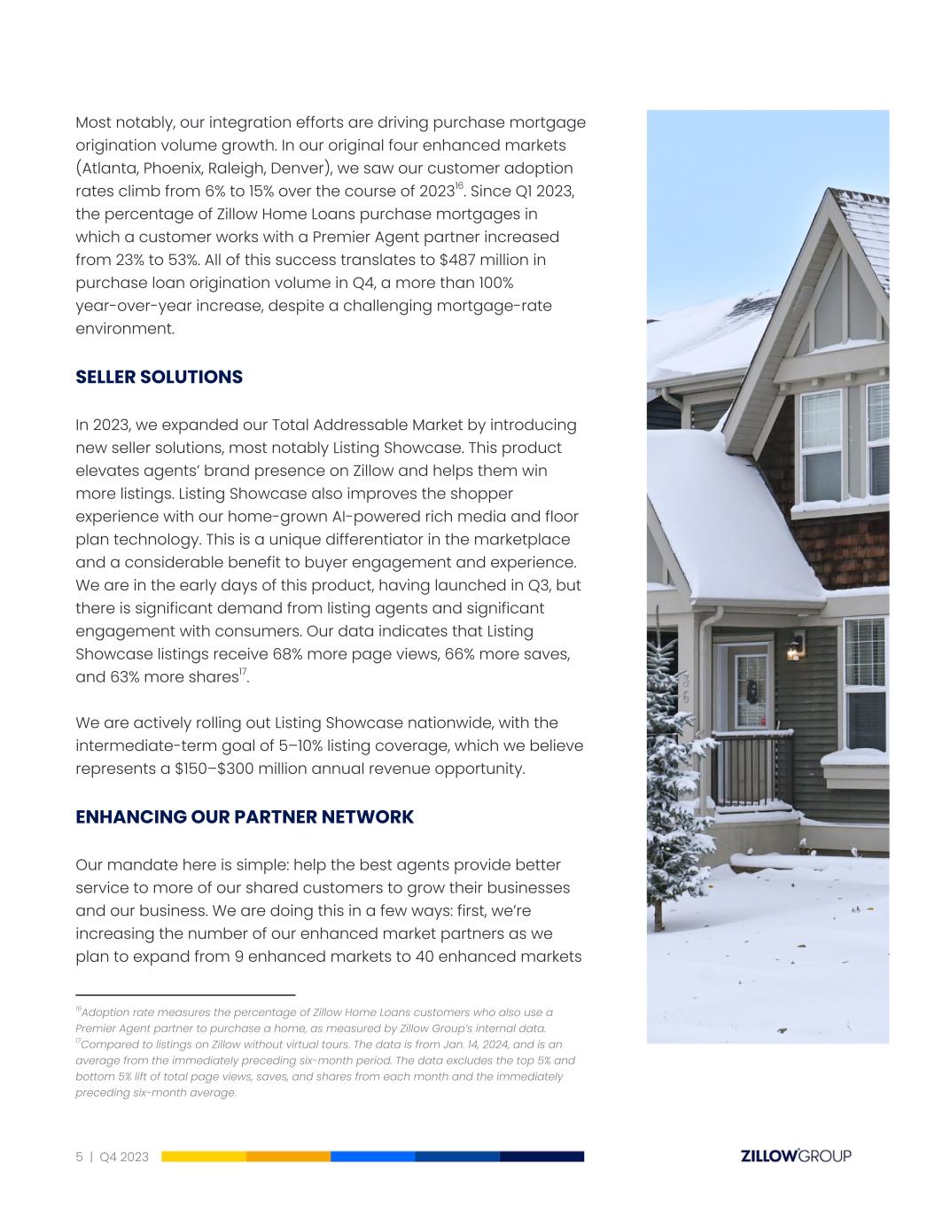 Most notably, our integration efforts are driving purchase mortgage origination volume growth. In our original four enhanced markets (Atlanta, Phoenix, Raleigh, Denver), we saw our customer adoption rates climb from 6% to 15% over the course of 2023 16 . Since Q1 2023, the percentage of Zillow Home Loans purchase mortgages in which a customer works with a Premier Agent partner increased from 23% to 53%. All of this success translates to $487 million in purchase loan origination volume in Q4, a more than 100% year-over-year increase, despite a challenging mortgage-rate environment. SELLER SOLUTIONS In 2023, we expanded our Total Addressable Market by introducing new seller solutions, most notably Listing Showcase. This product elevates agents’ brand presence on Zillow and helps them win more listings. Listing Showcase also improves the shopper experience with our home-grown AI-powered rich media and floor plan technology. This is a unique differentiator in the marketplace and a considerable benefit to buyer engagement and experience. We are in the early days of this product, having launched in Q3, but there is significant demand from listing agents and significant engagement with consumers. Our data indicates that Listing Showcase listings receive 68% more page views, 66% more saves, and 63% more shares 17 . We are actively rolling out Listing Showcase nationwide, with the intermediate-term goal of 5–10% listing coverage, which we believe represents a $150–$300 million annual revenue opportunity. ENHANCING OUR PARTNER NETWORK Our mandate here is simple: help the best agents provide better service to more of our shared customers to grow their businesses and our business. We are doing this in a few ways: first, we’re increasing the number of our enhanced market partners as we plan to expand from 9 enhanced markets to 40 enhanced markets 17 Compared to listings on Zillow without virtual tours . The data is from Jan. 14, 2024, and is an average from the immediately preceding six-month period. The data excludes the top 5% and bottom 5% lift of total page views, saves, and shares from each month and the immediately preceding six-month average . 16 Adoption rate measures the percentage of Zillow Home Loans customers who also use a Premier Agent partner to purchase a home, as measured by Zillow Group’s internal data. 5 | Q4 2023
