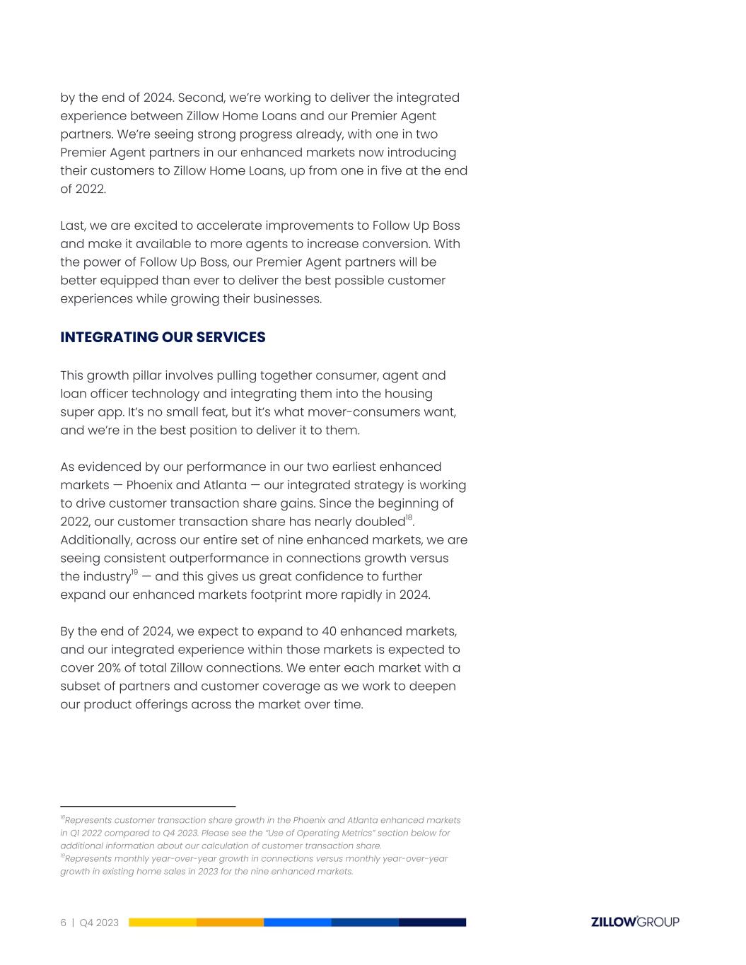 by the end of 2024. Second, we’re working to deliver the integrated experience between Zillow Home Loans and our Premier Agent partners. We’re seeing strong progress already, with one in two Premier Agent partners in our enhanced markets now introducing their customers to Zillow Home Loans, up from one in five at the end of 2022. Last, we are excited to accelerate improvements to Follow Up Boss and make it available to more agents to increase conversion. With the power of Follow Up Boss, our Premier Agent partners will be better equipped than ever to deliver the best possible customer experiences while growing their businesses. INTEGRATING OUR SERVICES This growth pillar involves pulling together consumer, agent and loan officer technology and integrating them into the housing super app. It’s no small feat, but it’s what mover-consumers want, and we’re in the best position to deliver it to them. As evidenced by our performance in our two earliest enhanced markets — Phoenix and Atlanta — our integrated strategy is working to drive customer transaction share gains. Since the beginning of 2022, our customer transaction share has nearly doubled 18 . Additionally, across our entire set of nine enhanced markets, we are seeing consistent outperformance in connections growth versus the industry 19 — and this gives us great confidence to further expand our enhanced markets footprint more rapidly in 2024. By the end of 2024, we expect to expand to 40 enhanced markets, and our integrated experience within those markets is expected to cover 20% of total Zillow connections. We enter each market with a subset of partners and customer coverage as we work to deepen our product offerings across the market over time. 19 Represents monthly year-over-year growth in connections versus monthly year-over-year growth in existing home sales in 2023 for the nine enhanced markets. 18 Represents customer transaction share growth in the Phoenix and Atlanta enhanced markets in Q1 2022 compared to Q4 2023. Please see the “Use of Operating Metrics” section below for additional information about our calculation of customer transaction share. 6 | Q4 2023