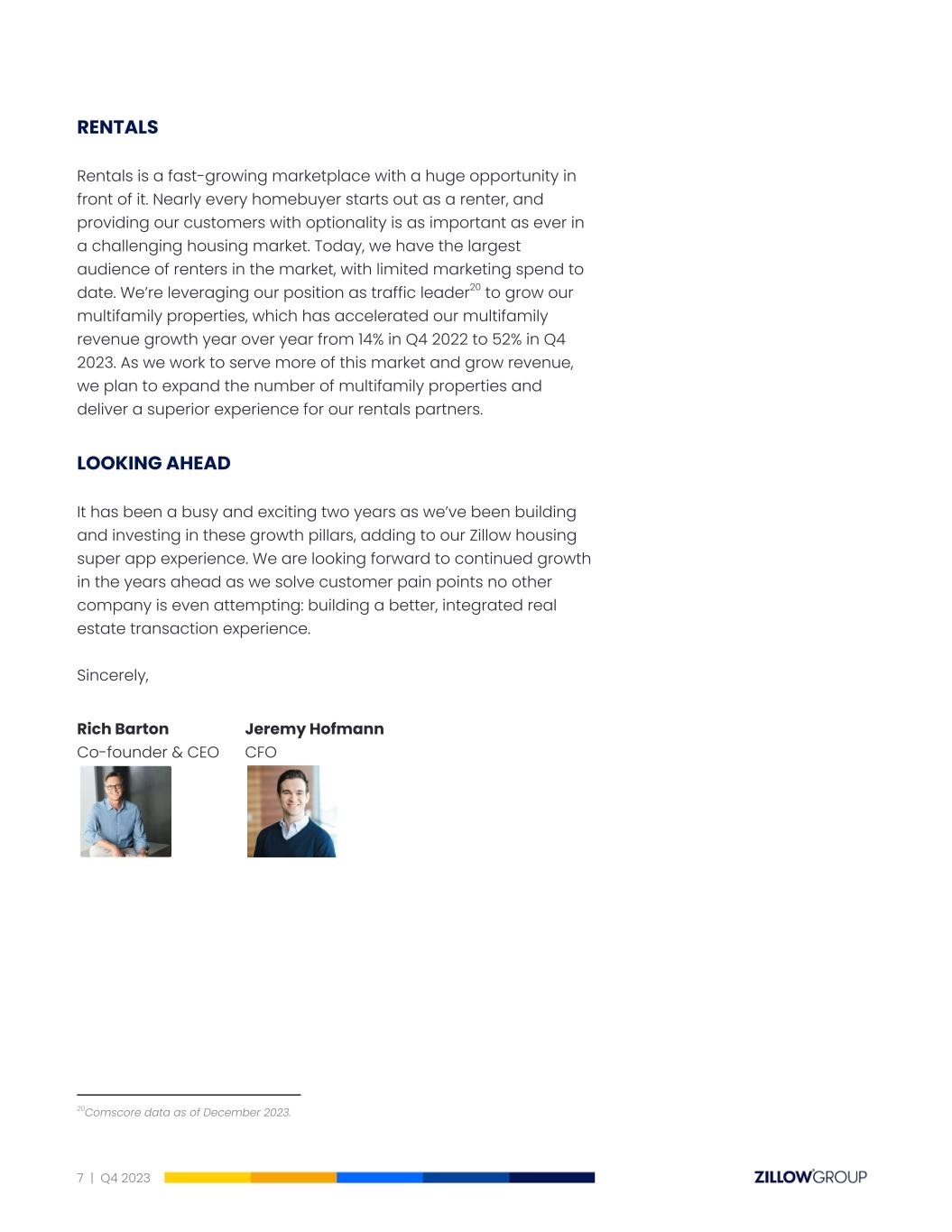 RENTALS Rentals is a fast-growing marketplace with a huge opportunity in front of it. Nearly every homebuyer starts out as a renter, and providing our customers with optionality is as important as ever in a challenging housing market. Today, we have the largest audience of renters in the market, with limited marketing spend to date. We’re leveraging our position as traffic leader 20 to grow our multifamily properties, which has accelerated our multifamily revenue growth year over year from 14% in Q4 2022 to 52% in Q4 2023. As we work to serve more of this market and grow revenue, we plan to expand the number of multifamily properties and deliver a superior experience for our rentals partners. LOOKING AHEAD It has been a busy and exciting two years as we’ve been building and investing in these growth pillars, adding to our Zillow housing super app experience. We are looking forward to continued growth in the years ahead as we solve customer pain points no other company is even attempting: building a better, integrated real estate transaction experience. Sincerely, Rich Barton Jeremy Hofmann Co-founder & CEO CFO 20 Comscore data as of December 2023. 7 | Q4 2023