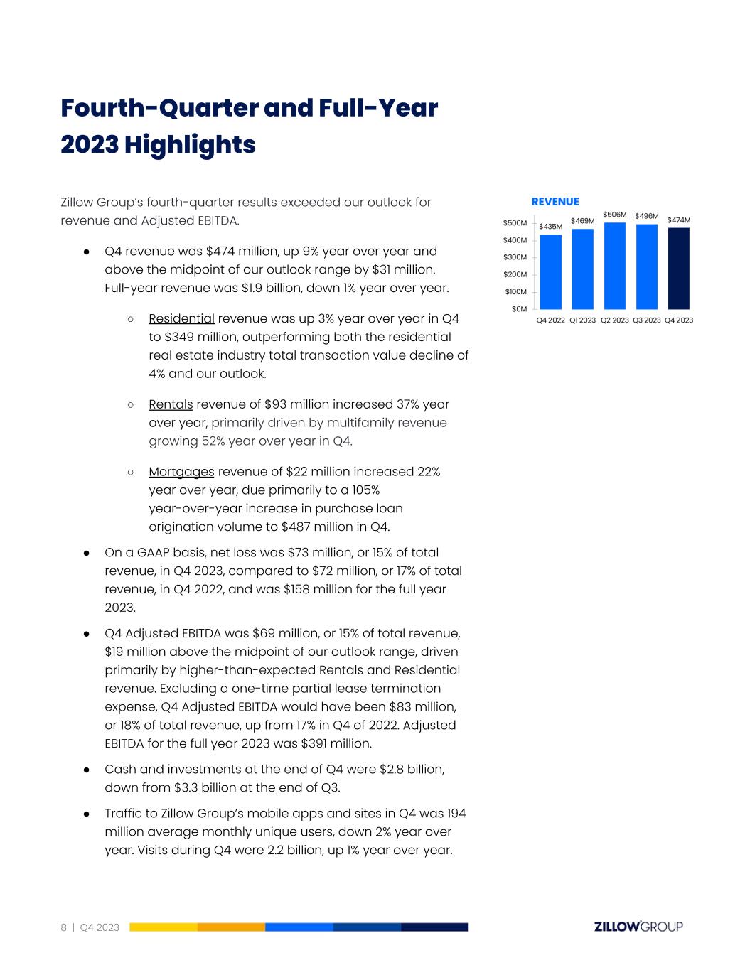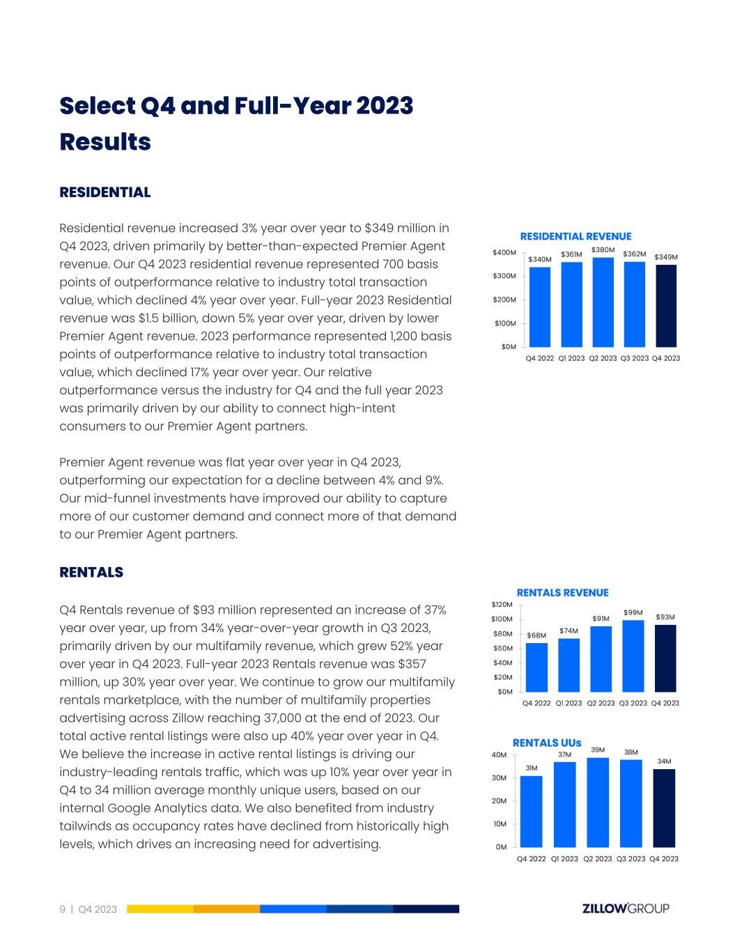 Fourth-Quarter and Full-Year 2023 Highlights Zillow Group’s fourth-quarter results exceeded our outlook for revenue and Adjusted EBITDA. ● Q4 revenue was $474 million, up 9% year over year and above the midpoint of our outlook range by $31 million. Full-year revenue was $1.9 billion, down 1% year over year. ○ Residential revenue was up 3% year over year in Q4 to $349 million, outperforming both the residential real estate industry total transaction value decline of 4% and our outlook. ○ Rentals revenue of $93 million increased 37% year over year, primarily driven by multifamily revenue growing 52% year over year in Q4. ○ Mortgages revenue of $22 million increased 22% year over year, due pri marily to a 105% year-over-year increase in purcha se loan origination volume to $487 million in Q4. ● On a GAAP basis, net loss was $73 millio n, or 15% of total revenue, in Q4 2023, compared to $72 million, or 17% of total revenue, in Q4 2022, and was $158 million for the full year 2023. ● Q4 Adjusted EBITDA was $69 million, or 15% of total revenue, $19 million above the midpoint of our outlook range, driven primarily by higher-than-expected Rentals and Residential revenue. Excluding a one-time partial lease termination expense, Q4 Adjusted EBITDA would have been $83 million, or 18% of total revenue, up from 17% in Q4 of 2022. Adjusted EBITDA for the full year 2023 was $391 million. ● Cash and investments at the end of Q4 were $2.8 billion, down from $3.3 billion at the end of Q3. ● Traffic to Zillow Group’s mobile apps and sites in Q4 was 194 million average monthly unique users, down 2% year over year. Visits during Q4 were 2.2 billion, up 1% year over year. 8 | Q4 2023