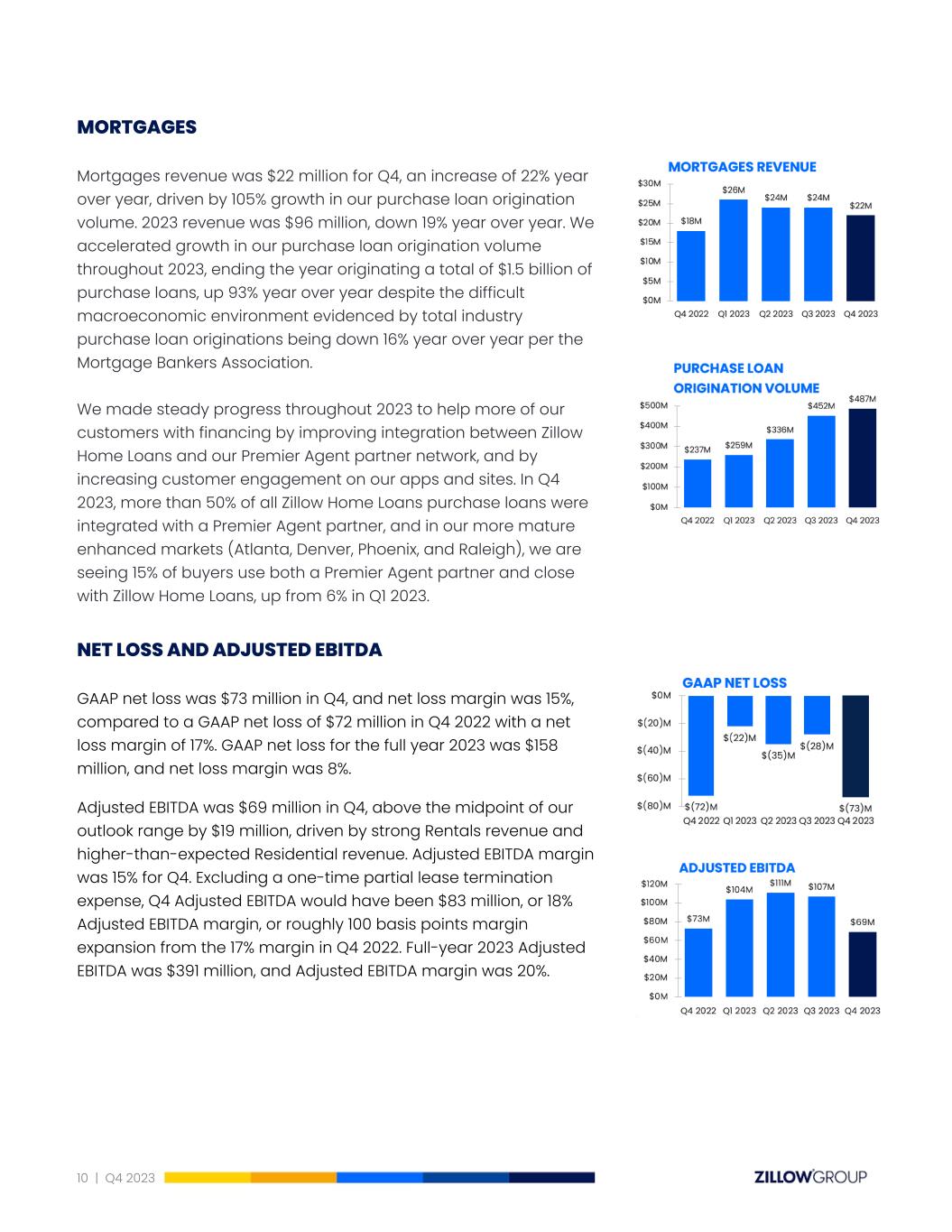 MORTGAGES Mortgages revenue was $22 million for Q4, an increase of 22% year over year, driven by 105% growth in our purchase loan origination volume. 2023 revenue was $96 million, down 19% year over year. We accelerated growth in our purchase loan origination volume throughout 2023, ending the year originating a total of $1.5 billion of purchase loans, up 93% year over year despite the difficult macroeconomic environment evidenced by total industry purchase loan originations being down 16% year over year per the Mortgage Bankers Association. We made steady progress throughout 2023 to help more of our customers with financing by improving integration between Zillow Home Loans and our Premier Agent partner network, and by increasing customer engagement on our apps and sites. In Q4 2023, more than 50% of all Zillow Home Loans purchase loans were integrated with a Premier Agent partner, and in our more mature enhanced markets (Atlanta, Denver, Phoenix, and Raleigh), we are seeing 15% of buyers use both a Premier Agent partner and close with Zillow Home Loans, up from 6% in Q1 2023. NET LOSS AND ADJUSTED EBITDA GAAP net loss was $73 million in Q4, and net loss margin was 15%, compared to a GAAP net loss of $72 million in Q4 2022 with a net loss margin of 17%. GAAP net loss for the full year 2023 was $158 million, and net loss margin was 8%. Adjusted EBITDA was $69 million in Q4, above the midpoint of our outlook range by $19 million, driven by strong Rentals revenue and higher-than-expected Residential revenue. Adjusted EBITDA margin was 15% for Q4. Excluding a one-time partial lease termination expense, Q4 Adjusted EBITDA would have been $83 million, or 18% Adjusted EBITDA margin, or roughly 100 basis points margin expansion from the 17% margin in Q4 2022. Full-year 2023 Adjusted EBITDA was $391 million, and Adjusted EBITDA margin was 20%. 10 | Q4 2023