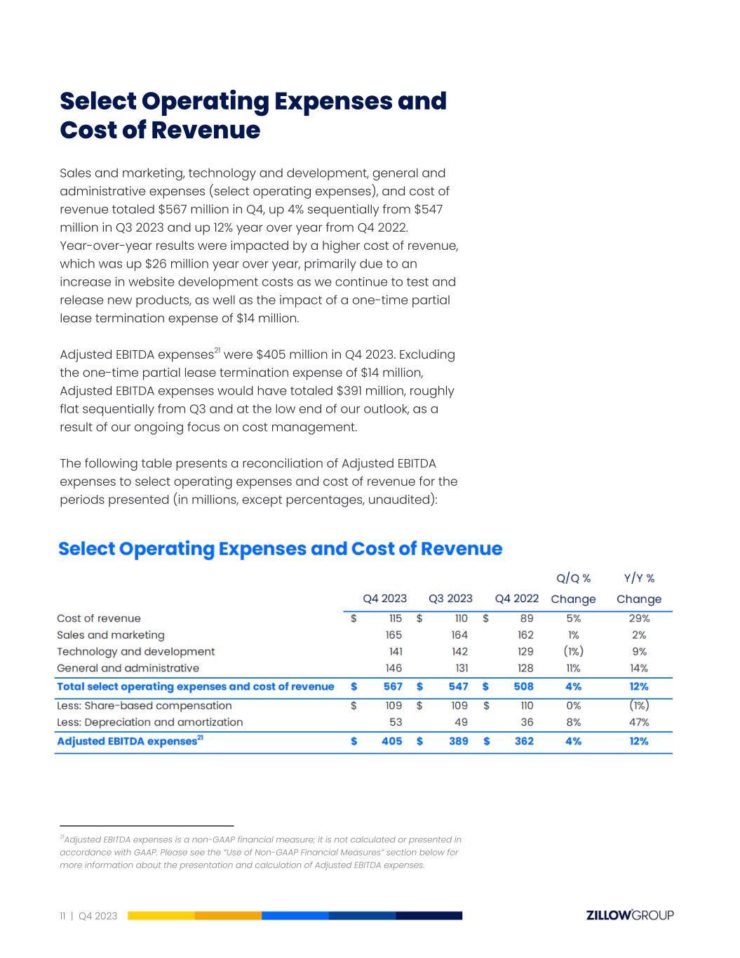 Select Operating Expenses and Cost of Revenue Sales and marketing, technology and development, general and administrative expenses (select operating expenses), and cost of revenue totaled $567 million in Q4, up 4% sequentially from $547 million in Q3 2023 and up 12% year over year from Q4 2022. Year-over-year results were impacted by a higher cost of revenue, which was up $26 million year over year, primarily due to an increase in website development costs as we continue to test and release new products, as well as the impact of a one-time partial lease termination expense of $14 million. Adjusted EBITDA expenses 21 were $405 million in Q4 2023. Excluding the one-time partial lease termination expense of $14 million, Adjusted EBITDA expenses would have totaled $391 million, roughly flat sequentially from Q3 and at the low end of our outlook, as a result of our ongoing focus on cost management. The following table presents a reconciliation of Adjusted EBITDA expenses to select operating expenses and cost of revenue for the periods presented (in millions, except percentages, unaudited): 21 Adjusted EBITDA expenses is a non-GAAP financial measure; it is not calculated or presented in accordance with GAAP. Please see the “Use of Non-GAAP Financial Measures” section below for more information about the presentation and calculation of Adjusted EBITDA expenses. 11 | Q4 2023