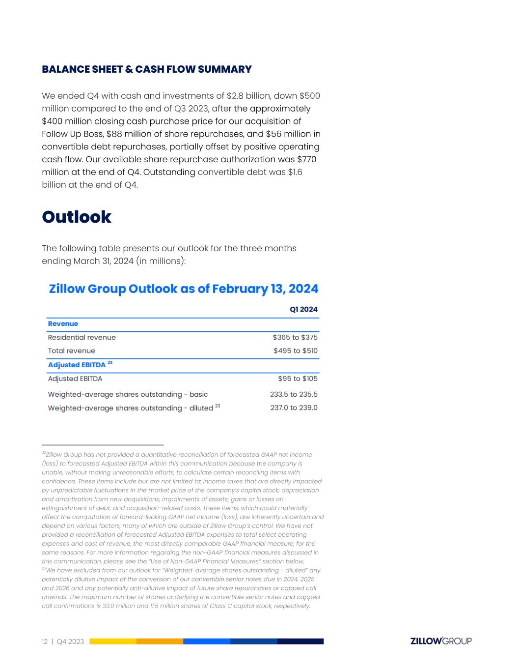 BALANCE SHEET & CASH FLOW SUMMARY We ended Q4 with cash and investments of $2.8 billion, down $500 million compared to the end of Q3 2023, after the approximately $400 million closing cash purchase price for our acquisition of Follow Up Boss, $88 million of share repurchases, and $56 million in convertible debt repurchases, partially offset by positive operating cash flow. Our available share repurchase authorization was $770 million at the end of Q4. Outstanding convertible debt was $1.6 billion at the end of Q4. Outlook The following table presents our outlook for the three months ending March 31, 2024 (in millions): 22 23 23 We have excluded from our outlook for “Weighted-average shares outstanding - diluted” any potentially dilutive impact of the conversion of our convertible senior notes due in 2024, 2025 and 2026 and any potentially anti-dilutive impact of future share repurchases or capped call unwinds. The maximum number of shares underlying the convertible senior notes and capped call confirmations is 33.0 million and 11.5 million shares of Class C capital stock, respectively. 22 Zillow Group has not provided a quantitative reconciliation of forecasted GAAP net income (loss) to forecasted Adjusted EBITDA within this communication because the company is unable, without making unreasonable efforts, to calculate certain reconciling items with confidence. These items include but are not limited to: income taxes that are directly impacted by unpredictable fluctuations in the market price of the company’s capital stock; depreciation and amortization from new acquisitions; impairments of assets; gains or losses on extinguishment of debt; and acquisition-related costs. These items, which could materially affect the computation of forward-looking GAAP net income (loss), are inherently uncertain and depend on various factors, many of which are outside of Zillow Group’s control. We have not provided a reconciliation of forecasted Adjusted EBITDA expenses to total select operating expenses and cost of revenue, the most directly comparable GAAP financial measure, for the same reasons. For more information regarding the non-GAAP financial measures discussed in this communication, please see the “Use of Non-GAAP Financial Measures” section below. 12 | Q4 2023