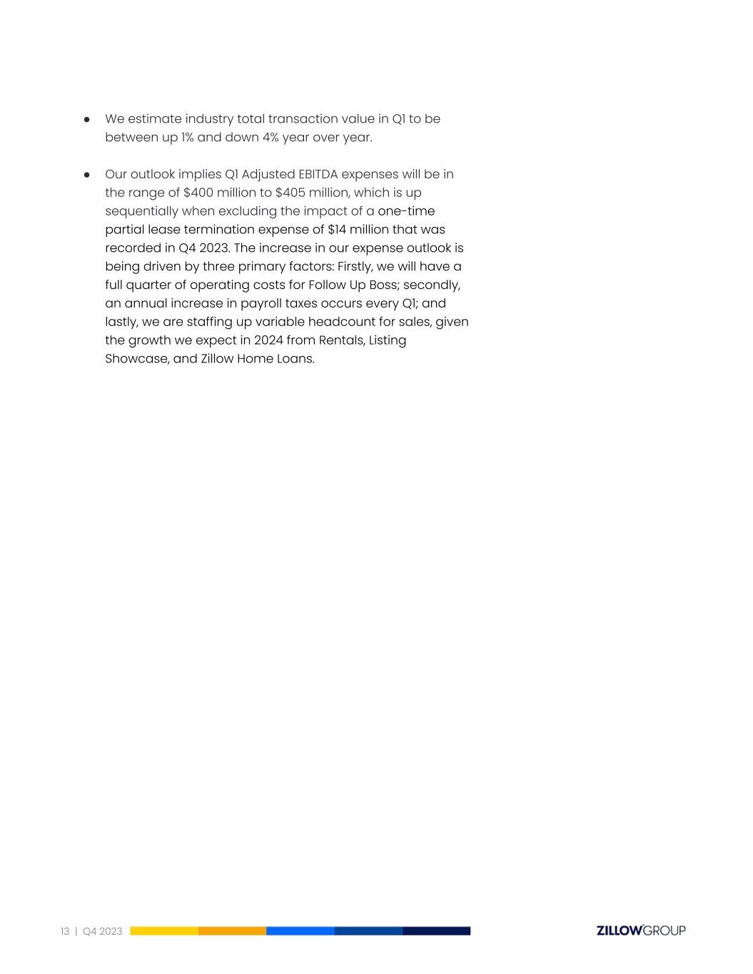 ● We estimate industry total transaction value in Q1 to be between up 1% and down 4% year over year. ● Our outlook implies Q1 Adjusted EBITDA expenses will be in the range of $400 million to $405 million, which is up sequentially when excluding the impact of a one-time partial lease termination expense of $14 million that was recorded in Q4 2023. The increase in our expense outlook is being driven by three primary factors: Firstly, we will have a full quarter of operating costs for Follow Up Boss; secondly, an annual increase in payroll taxes occurs every Q1; and lastly, we are staffing up variable headcount for sales, given the growth we expect in 2024 from Rentals, Listing Showcase, and Zillow Home Loans. 13 | Q4 2023