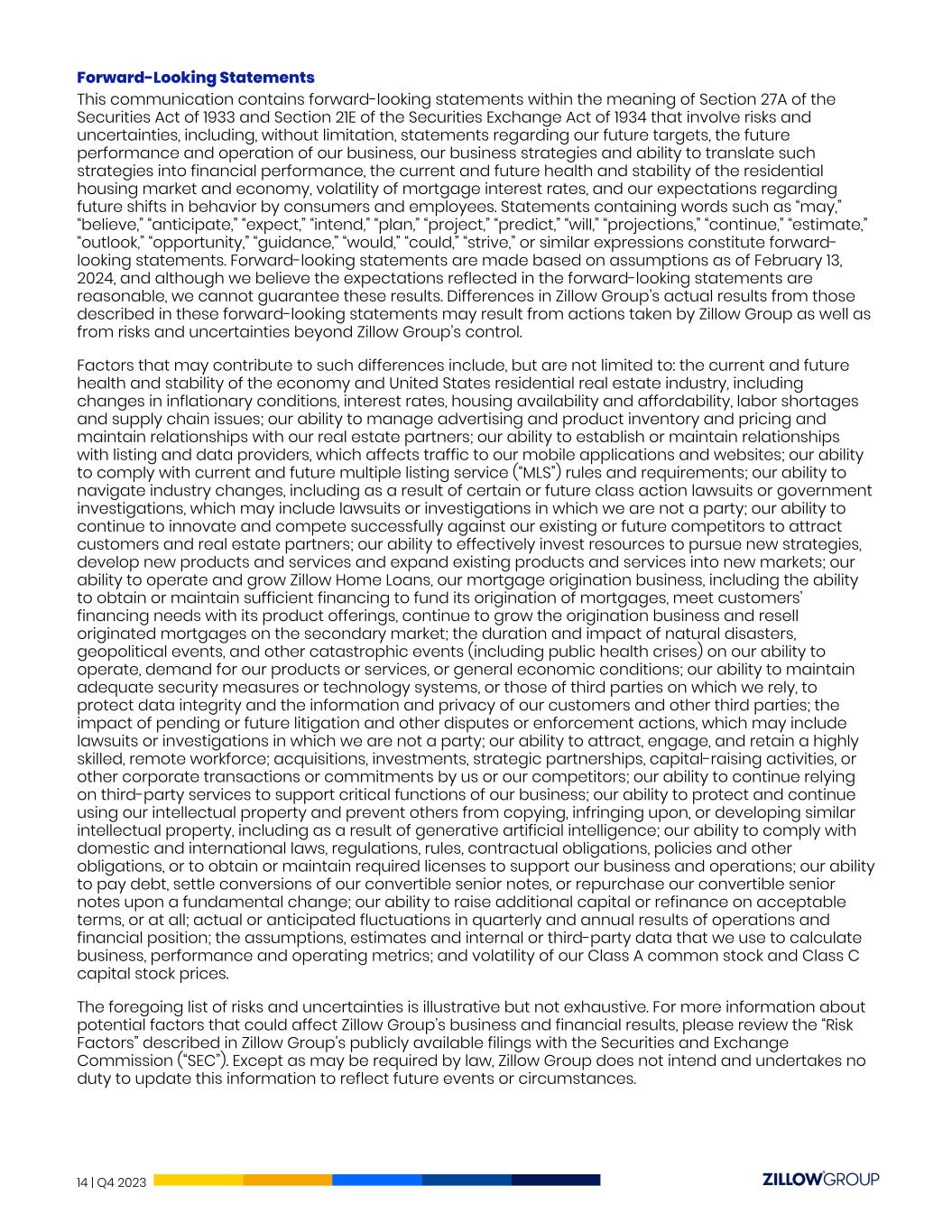 Forward-Looking Statements This communication contains forward-looking statements within the meaning of Section 27A of the Securities Act of 1933 and Section 21E of the Securities Exchange Act of 1934 that involve risks and uncertainties, including, without limitation, statements regarding our future targets, the future performance and operation of our business, our business strategies and ability to translate such strategies into financial performance, the current and future health and stability of the residential housing market and economy, volatility of mortgage interest rates, and our expectations regarding future shifts in behavior by consumers and employees. Statements containing words such as “may,” “believe,” “anticipate,” “expect,” “intend,” “plan,” “project,” “predict,” “will,” “projections,” “continue,” “estimate,” “outlook,” “opportunity,” “guidance,” “would,” “could,” “strive,” or similar expressions constitute forward- looking statements. Forward-looking statements are made based on assumptions as of February 13, 2024, and although we believe the expectations reflected in the forward-looking statements are reasonable, we cannot guarantee these results. Differences in Zillow Group’s actual results from those described in these forward-looking statements may result from actions taken by Zillow Group as well as from risks and uncertainties beyond Zillow Group’s control. Factors that may contribute to such differences include, but are not limited to: the current and future health and stability of the economy and United States residential real estate industry, including changes in inflationary conditions, interest rates, housing availability and affordability, labor shortages and supply chain issues; our ability to manage advertising and product inventory and pricing and maintain relationships with our real estate partners; our ability to establish or maintain relationships with listing and data providers, which affects traffic to our mobile applications and websites; our ability to comply with current and future multiple listing service (“MLS”) rules and requirements; our ability to navigate industry changes, including as a result of certain or future class action lawsuits or government investigations, which may include lawsuits or investigations in which we are not a party; our ability to continue to innovate and compete successfully against our existing or future competitors to attract customers and real estate partners; our ability to effectively invest resources to pursue new strategies, develop new products and services and expand existing products and services into new markets; our ability to operate and grow Zillow Home Loans, our mortgage origination business, including the ability to obtain or maintain sufficient financing to fund its origination of mortgages, meet customers’ financing needs with its product offerings, continue to grow the origination business and resell originated mortgages on the secondary market; the duration and impact of natural disasters, geopolitical events, and other catastrophic events (including public health crises) on our ability to operate, demand for our products or services, or general economic conditions; our ability to maintain adequate security measures or technology systems, or those of third parties on which we rely, to protect data integrity and the information and privacy of our customers and other third parties; the impact of pending or future litigation and other disputes or enforcement actions, which may include lawsuits or investigations in which we are not a party; our ability to attract, engage, and retain a highly skilled, remote workforce; acquisitions, investments, strategic partnerships, capital-raising activities, or other corporate transactions or commitments by us or our competitors; our ability to continue relying on third-party services to support critical functions of our business; our ability to protect and continue using our intellectual property and prevent others from copying, infringing upon, or developing similar intellectual property, including as a result of generative artificial intelligence; our ability to comply with domestic and international laws, regulations, rules, contractual obligations, policies and other obligations, or to obtain or maintain required licenses to support our business and operations; our ability to pay debt, settle conversions of our convertible senior notes, or repurchase our convertible senior notes upon a fundamental change; our ability to raise additional capital or refinance on acceptable terms, or at all; actual or anticipated fluctuations in quarterly and annual results of operations and financial position; the assumptions, estimates and internal or third-party data that we use to calculate business, performance and operating metrics; and volatility of our Class A common stock and Class C capital stock prices. The foregoing list of risks and uncertainties is illustrative but not exhaustive. For more information about potential factors that could affect Zillow Group’s business and financial results, please review the “Risk Factors” described in Zillow Group’s publicly available filings with the Securities and Exchange Commission (“SEC”). Except as may be required by law, Zillow Group does not intend and undertakes no duty to update this information to reflect future events or circumstances. 14 | Q4 2023