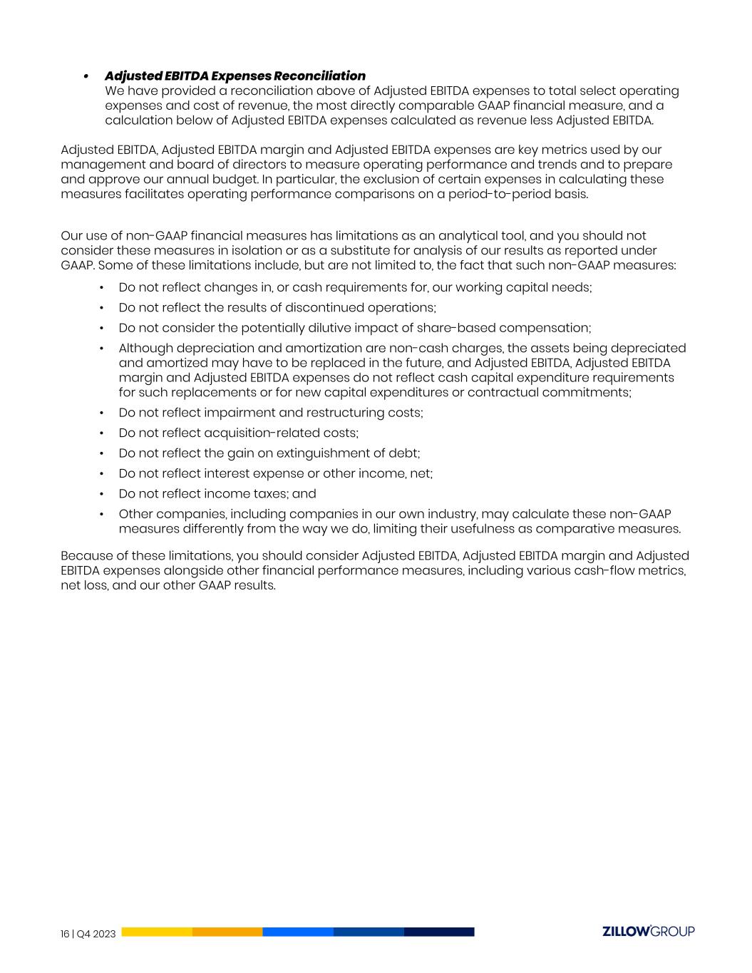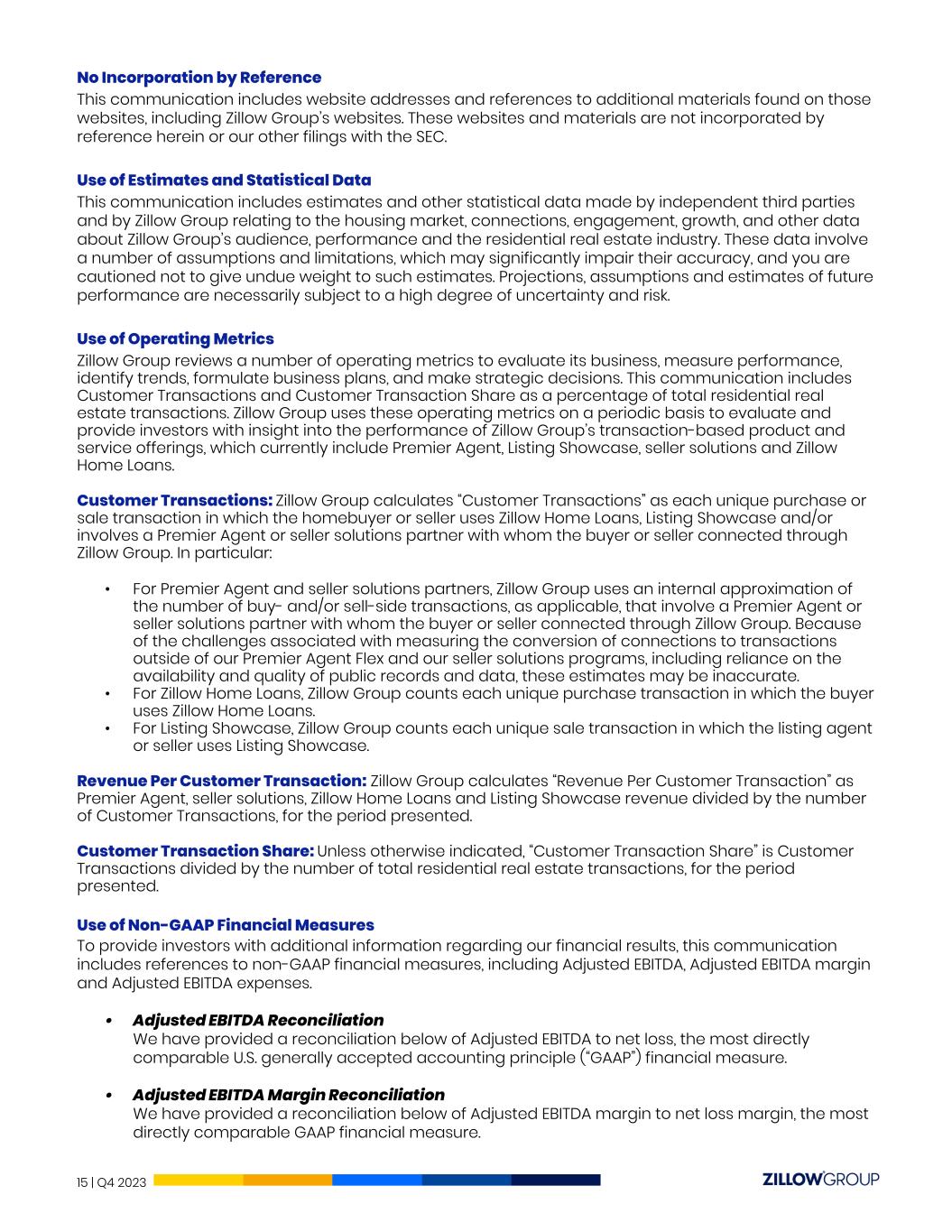 No Incorporation by Reference This communication includes website addresses and references to additional materials found on those websites, including Zillow Group’s websites. These websites and materials are not incorporated by reference herein or our other filings with the SEC. Use of Estimates and Statistical Data This communication includes estimates and other statistical data made by independent third parties and by Zillow Group relating to the housing market, connections, engagement, growth, and other data about Zillow Group’s audience, performance and the residential real estate industry. These data involve a number of assumptions and limitations, which may significantly impair their accuracy, and you are cautioned not to give undue weight to such estimates. Projections, assumptions and estimates of future performance are necessarily subject to a high degree of uncertainty and risk. Use of Operating Metrics Zillow Group reviews a number of operating metrics to evaluate its business, measure performance, identify trends, formulate business plans, and make strategic decisions. This communication includes Customer Transactions and Customer Transaction Share as a percentage of total residential real estate transactions. Zillow Group uses these operating metrics on a periodic basis to evaluate and provide investors with insight into the performance of Zillow Group’s transaction-based product and service offerings, which currently include Premier Agent, Listing Showcase, seller solutions and Zillow Home Loans. Customer Transactions: Zillow Group calculates “Customer Transactions” as each unique purchase or sale transaction in which the homebuyer or seller uses Zillow Home Loans, Listing Showcase and/or involves a Premier Agent or seller solutions partner with whom the buyer or seller connected through Zillow Group. In particular: • For Premier Agent and seller solutions partners, Zillow Group uses an internal approximation of the number of buy- and/or sell-side transactions, as applicable, that involve a Premier Agent or seller solutions partner with whom the buyer or seller connected through Zillow Group. Because of the challenges associated with measuring the conversion of connections to transactions outside of our Premier Agent Flex and our seller solutions programs, including reliance on the availability and quality of public records and data, these estimates may be inaccurate. • For Zillow Home Loans, Zillow Group counts each unique purchase transaction in which the buyer uses Zillow Home Loans. • For Listing Showcase, Zillow Group counts each unique sale transaction in which the listing agent or seller uses Listing Showcase. Revenue Per Customer Transaction: Zillow Group calculates “Revenue Per Customer Transaction” as Premier Agent, seller solutions, Zillow Home Loans and Listing Showcase revenue divided by the number of Customer Transactions, for the period presented. Customer Transaction Share: Unless otherwise indicated, “Customer Transaction Share” is Customer Transactions divided by the number of total residential real estate transactions, for the period presented. Use of Non-GAAP Financial Measures To provide investors with additional information regarding our financial results, this communication includes references to non-GAAP financial measures, including Adjusted EBITDA, Adjusted EBITDA margin and Adjusted EBITDA expenses. • Adjusted EBITDA Reconciliation We have provided a reconciliation below of Adjusted EBITDA to net loss, the most directly comparable U.S. generally accepted accounting principle (“GAAP”) financial measure. • Adjusted EBITDA Margin Reconciliation We have provided a reconciliation below of Adjusted EBITDA margin to net loss margin, the most directly comparable GAAP financial measure. 15 | Q4 2023