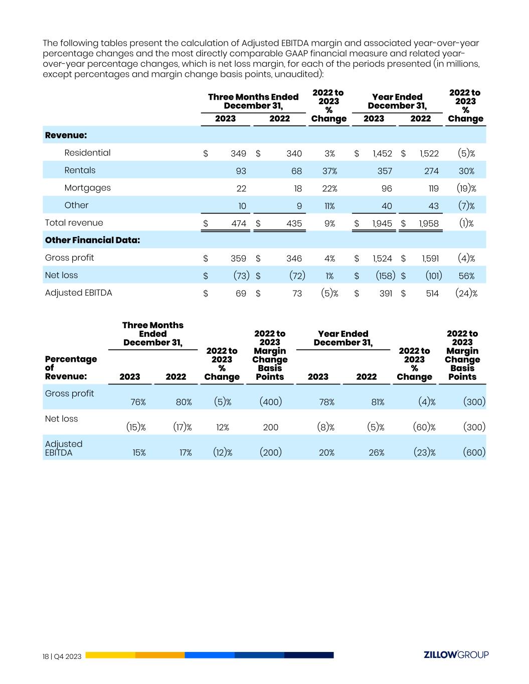 The following tables present the calculation of Adjusted EBITDA margin and associated year-over-year percentage changes and the most directly comparable GAAP financial measure and related year- over-year percentage changes, which is net loss margin, for each of the periods presented (in millions, except percentages and margin change basis points, unaudited): Three Months Ended December 31, 2022 to  2023 % Change Year Ended December 31, 2022 to  2023 % Change2023 2022 2023 2022 Revenue: Residential $ 349 $ 340 3% $ 1,452 $ 1,522 (5)% Rentals 93 68 37% 357 274 30% Mortgages 22 18 22% 96 119 (19)% Other 10 9 11% 40 43 (7)% Total revenue $ 474 $ 435 9% $ 1,945 $ 1,958 (1)% Other Financial Data: Gross profit $ 359 $ 346 4% $ 1,524 $ 1,591 (4)% Net loss $ (73) $ (72) 1% $ (158) $ (101) 56% Adjusted EBITDA $ 69 $ 73 (5)% $ 391 $ 514 (24)% Three Months Ended December 31, 2022 to 2023 % Change 2022 to 2023 Margin Change Basis Points Year Ended December 31, 2022 to 2023 % Change 2022 to 2023 Margin Change Basis Points Percentage of Revenue: 2023 2022 2023 2022 Gross profit 76 % 80 % (5)% (400) 78 % 81 % (4) % (300) Net loss (15) % (17) % 12% 200 (8) % (5) % (60) % (300) Adjusted EBITDA 15 % 17 % (12)% (200) 20 % 26 % (23) % (600) 18 | Q4 2023