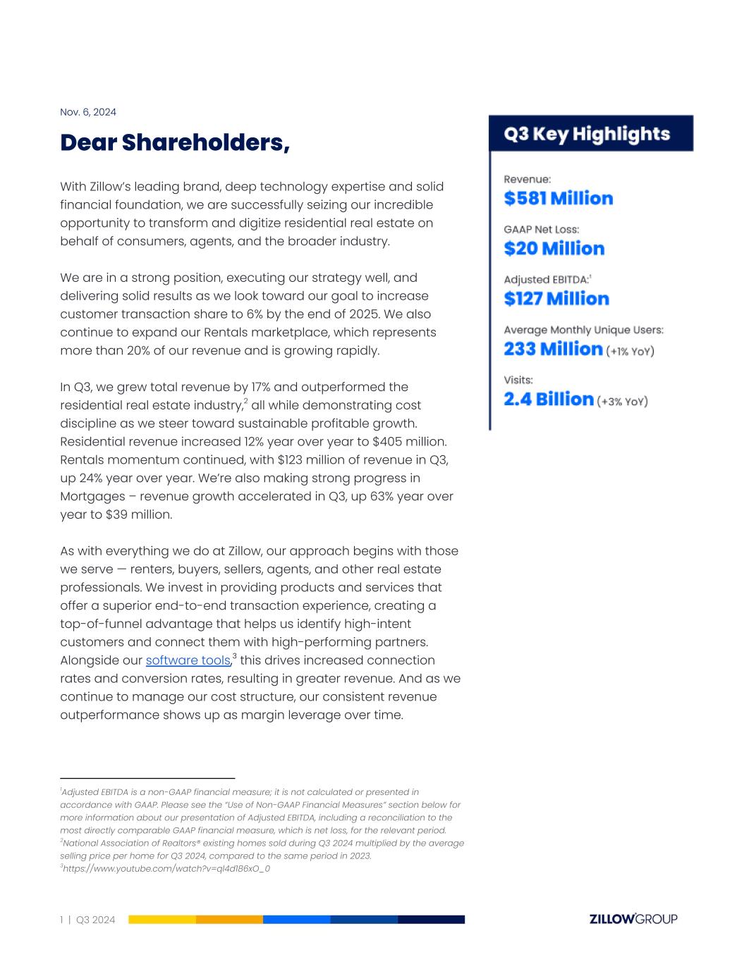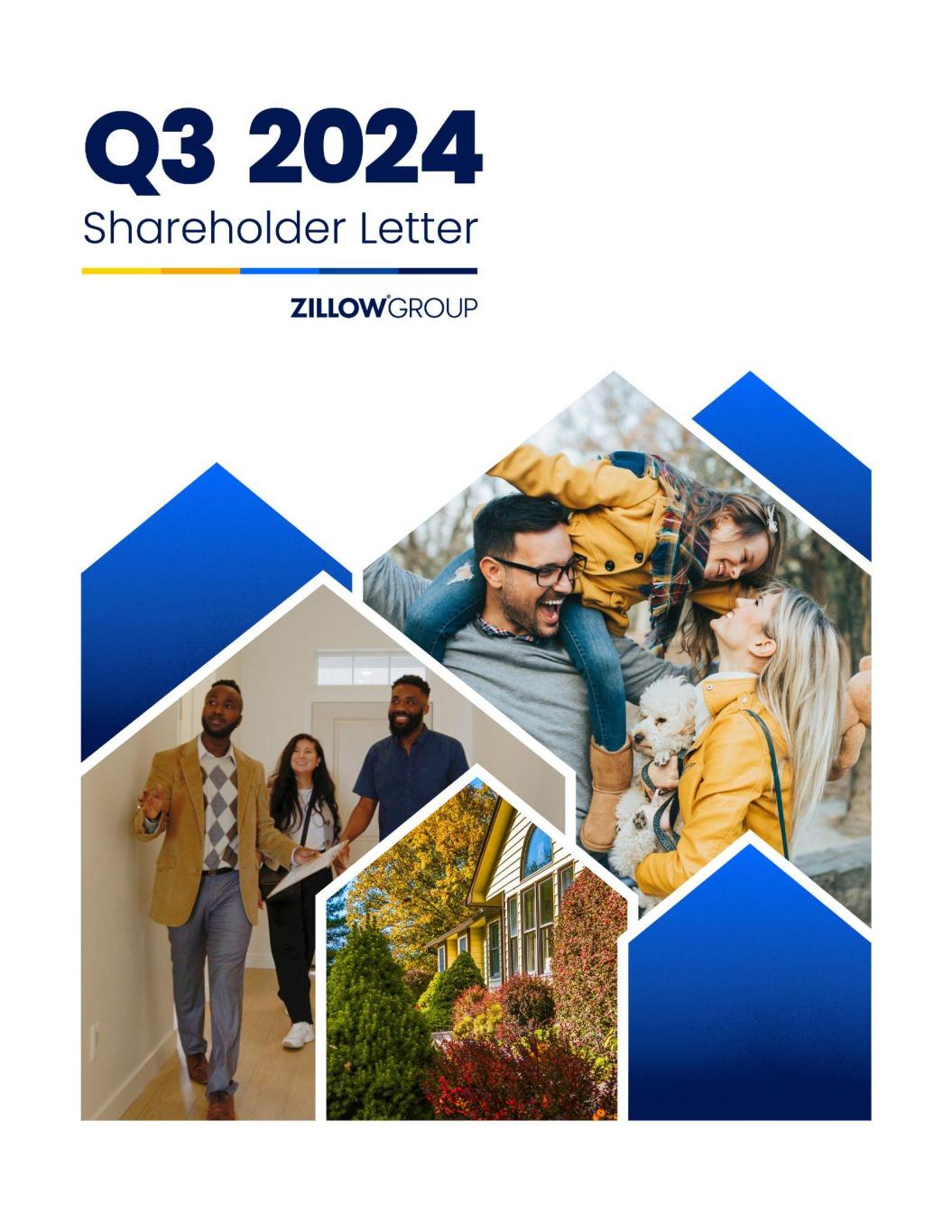 Nov. 6, 2024 Dear Shareholders, With Zillow’s leading brand, deep technology expertise and solid financial foundation, we are successfully seizing our incredible opportunity to transform and digitize residential real estate on behalf of consumers, agents, and the broader industry. We are in a strong position, executing our strategy well, and delivering solid results as we look toward our goal to increase customer transaction share to 6% by the end of 2025. We also continue to expand our Rentals marketplace, which represents more than 20% of our revenue and is growing rapidly..1 In Q3, we grew total revenue by 17% and outperformed the residential real estate industry,2 all while demonstrating cost discipline as we steer toward sustainable profitable growth. Residential revenue increased 12% year over year to $405 million. Rentals momentum continued, with $123 million of revenue in Q3, up 24% year over year. We’re also making strong progress in Mortgages – revenue growth accelerated in Q3, up 63% year over year to $39 million. As with everything we do at Zillow, our approach begins with those we serve — renters, buyers, sellers, agents, and other real estate professionals. We invest in providing products and services that offer a superior end-to-end transaction experience, creating a top-of-funnel advantage that helps us identify high-intent customers and connect them with high-performing partners. Alongside our software tools,3 this drives increased connection rates and conversion rates, resulting in greater revenue. And as we continue to manage our cost structure, our consistent revenue outperformance shows up as margin leverage over time. 3https://www.youtube.com/watch?v=ql4d186xO_0 2National Association of Realtors® existing homes sold during Q3 2024 multiplied by the average selling price per home for Q3 2024, compared to the same period in 2023. 1Adjusted EBITDA is a non-GAAP financial measure; it is not calculated or presented in accordance with GAAP. Please see the “Use of Non-GAAP Financial Measures” section below for more information about our presentation of Adjusted EBITDA, including a reconciliation to the most directly comparable GAAP financial measure, which is net loss, for the relevant period. 1 | Q3 2024