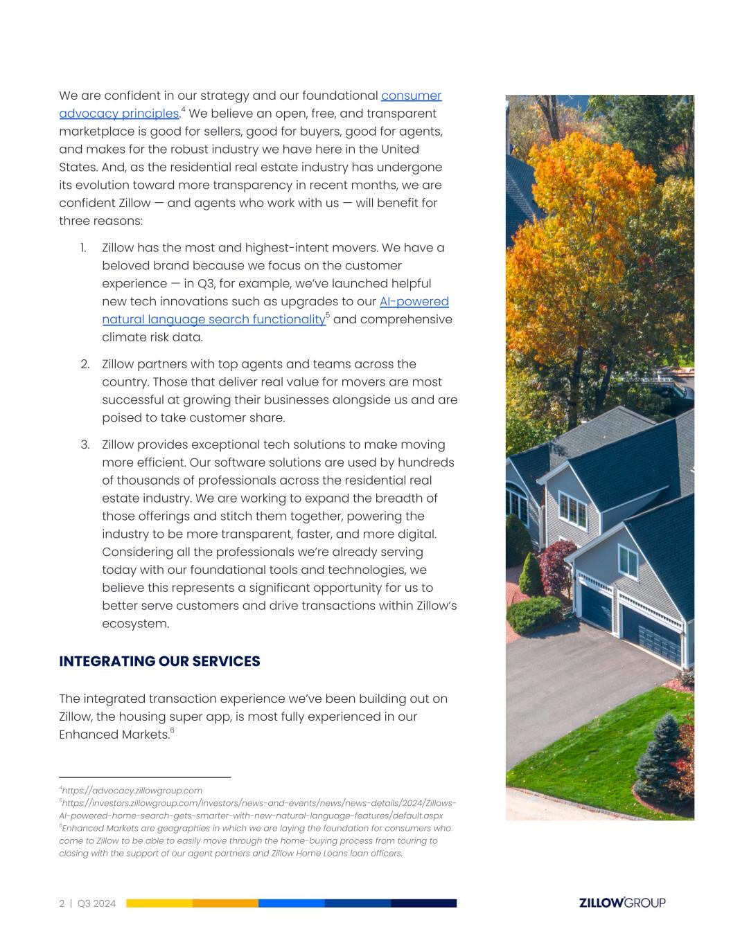 We are confident in our strategy and our foundational consumer advocacy principles.4 We believe an open, free, and transparent marketplace is good for sellers, good for buyers, good for agents, and makes for the robust industry we have here in the United States. And, as the residential real estate industry has undergone its evolution toward more transparency in recent months, we are confident Zillow — and agents who work with us — will benefit for three reasons: 1. Zillow has the most and highest-intent movers. We have a beloved brand because we focus on the customer experience — in Q3, for example, we’ve launched helpful new tech innovations such as upgrades to our AI-powered natural language search functionality5 and comprehensive climate risk data. 2. Zillow partners with top agents and teams across the country. Those that deliver real value for movers are most successful at growing their businesses alongside us and are poised to take customer share. 3. Zillow provides exceptional tech solutions to make moving more efficient. Our software solutions are used by hundreds of thousands of professionals across the residential real estate industry. We are working to expand the breadth of those offerings and stitch them together, powering the industry to be more transparent, faster, and more digital. Considering all the professionals we’re already serving today with our foundational tools and technologies, we believe this represents a significant opportunity for us to better serve customers and drive transactions within Zillow’s ecosystem. INTEGRATINGOUR SERVICES The integrated transaction experience we’ve been building out on Zillow, the housing super app, is most fully experienced in our Enhanced Markets.6 6Enhanced Markets are geographies in which we are laying the foundation for consumers who come to Zillow to be able to easily move through the home-buying process from touring to closing with the support of our agent partners and Zillow Home Loans loan officers. 5https://investors.zillowgroup.com/investors/news-and-events/news/news-details/2024/Zillows- AI-powered-home-search-gets-smarter-with-new-natural-language-features/default.aspx 4https://advocacy.zillowgroup.com 2 | Q3 2024