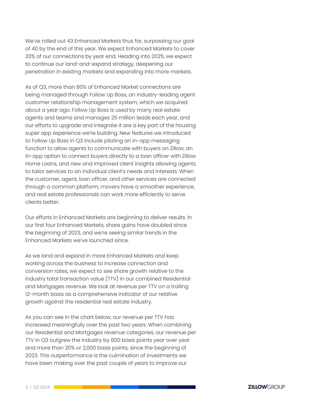 We’ve rolled out 43 Enhanced Markets thus far, surpassing our goal of 40 by the end of this year. We expect Enhanced Markets to cover 20% of our connections by year end. Heading into 2025, we expect to continue our land-and-expand strategy, deepening our penetration in existing markets and expanding into more markets. As of Q3, more than 80% of Enhanced Market connections are being managed through Follow Up Boss, an industry-leading agent customer relationship management system, which we acquired about a year ago. Follow Up Boss is used by many real estate agents and teams and manages 25 million leads each year, and our efforts to upgrade and integrate it are a key part of the housing super app experience we’re building. New features we introduced to Follow Up Boss in Q3 include piloting an in-app messaging function to allow agents to communicate with buyers on Zillow, an in-app option to connect buyers directly to a loan officer with Zillow Home Loans, and new and improved client insights allowing agents to tailor services to an individual client’s needs and interests. When the customer, agent, loan officer, and other services are connected through a common platform, movers have a smoother experience, and real estate professionals can work more efficiently to serve clients better. Our efforts in Enhanced Markets are beginning to deliver results. In our first four Enhanced Markets, share gains have doubled since the beginning of 2023, and we’re seeing similar trends in the Enhanced Markets we’ve launched since. As we land and expand in more Enhanced Markets and keep working across the business to increase connection and conversion rates, we expect to see share growth relative to the industry total transaction value (TTV) in our combined Residential and Mortgages revenue. We look at revenue per TTV on a trailing 12-month basis as a comprehensive indicator of our relative growth against the residential real estate industry. As you can see in the chart below, our revenue per TTV has increased meaningfully over the past two years. When combining our Residential and Mortgages revenue categories, our revenue per TTV in Q3 outgrew the industry by 800 basis points year over year and more than 20% or 2,000 basis points, since the beginning of 2023. This outperformance is the culmination of investments we have been making over the past couple of years to improve our 3 | Q3 2024